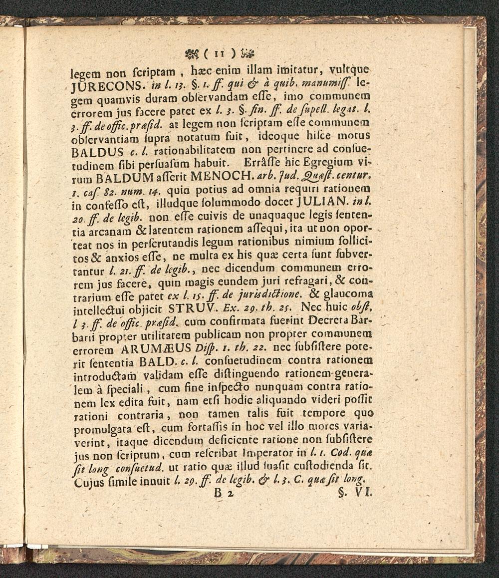 legem non fcriptam , hasc enira illara imitarur, vulrqueJURECONS. w l. t;. §. /. ff. c/ui & a. quib. manumiff. ie-gera quamvis duram obfervandam efle, iuio communcraerrorem jus focere paret ex /. j. §• fin. ff. de fupell. legtt. I.}. ff.de offic.prafid. ac legem non icriptam e(7e communeraoblervantiam iupra nocatum fuit, ideoque hifce mocusBALDUS c. /. rationabilitatera non pertinere ad conlue-tudinem llbi perfualum habuit. Errafle hic Egregiura vi-rura BALDUMaflerit MENOCH. arb.Jud.gnpft.centur.i. caf 8z. num. 14. quin potius ad omnia requin ratiouerrjin confeflb eft, iliudque folummodo docec JULIAN. inl.20. ff de lcgib. non efle cuivis de unaquaque legis fenren-tia arcanam &Iarenrem racionera alTequi,ira utuon opor-teat nos in perfcrurandis legum racionibus nimium follici-tos& anxios elTe, ne mulca ex his quse cerca funt fubver-tantur /. 21: ff. de lcgtb>. , nec dicendum communein erro-rem jus facere, quin magis eundem juri refragari, & con-trarium elTe parer ex l. is-ff dt jurhditfione. & glaucomaiuceliedtui objicit STRUV. Ex. 29. th. 2/. Nec huic obft,I j.ff. de offic. ■pr.itfid. curo confirmata fuerinc DecreraBar-bani propcer urilirarera publicam non proprer communemerrorera ARUMiEUS Diff. 1. th. 22. nec fubfiftere pote-rir fententia BALD. c. /. confuetudinem contra rarionemintroductam vabdam efle diftinguendo rarioneui genera-Iem a fpeciali, cum fine infpe&o nunquam contra ratio-nem Iex edira fuir, nam etfi hodie aliquando videri potficracioni concraria, non tamen talis fuic teropore quopromulgata eft, cum fortaffis in hoc vel illo mores varia-verint, itaque dicendum deficienre rarione non fubfiflerejns non icriprum, cum refcribat Imperator in /. t. Cod. quafit long confuetud. ut ratio quse illud luafit cuftodienda fit.Cujus fimile innuic /. 29. ff dc legib. ejr /. j. c. quxfit lon*.