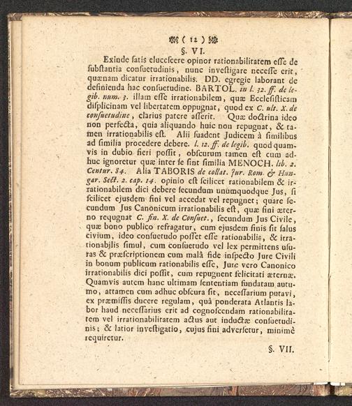 Exiude fatis eluccfcere opinor rationnbiliratem efle defubftantia confuetudinis, nunc inveftigare neceffe eric,qusenam dicatur irrationabilis. DD. egregie laborant dedefinieuda hac confuctudine. BARTOJL. tn l. 32. ff. de le-gib. nttm. 3. illam effe irrationabilem, quas Ecclefifticamdifplicinam vel libertatetn.oppugnat, quod ex C. ult. X.deconfttetttdine , clarius patere afTerir. Qua: dodtrina ideonon perfedta, quia aiiquando huic non repugnar, & ta-men irrationabilis eft. Alii fuadent Judicem a fimiltbuSad fimilia procedere debere. L12.ff.de/egib. quodquam-vis in dubio fieri poffit, obfcurum tamen eft cum ad-huc ignoretur quaj inrer fe flnc fimilia MENOCH. lib. 2.Centur. 84. Alia TABORIS de collat. fttr. Rom- & Httn-gar. Sccl. 2. cap. 14. opinio eft fcilicec rationabilem & ir-rationabilem dici debere fecundum unumquodque Jus, fifcilicec ejusdem fini vel accedac vel repugnec; quare fe-cundum Jus CanOnicum irrationabilis eft, quas fini ceter-no requgnac C. jin. X. de Conftet., fecundum Jus Civile,quas bono publico refragatur, cnm ejusdem finis fit faluscivium, ideo confuerudo polTet efTe rationabilis, 8c irra-tionabilis fimul, cura coufuerudo vel lex permittens ufu-ras & prcefcriptionem cum mala fide infpe&o Jure Civiliin bonum publicum rationabilis efTe, Jure vero Canonicoirrationabilis dici poffir, cum repugnenc felicitati jeterna?.Quamvis autem hauc ultimam fententiam fundaram autu-mo, attamen cum adhuc obfcura fit, neceffarium puravi,ex prasmiffis ducere regulam, qua ponderata Atlantis la-bor haud necefTarius erit ad cognoiccndam rationabilita-rem vel irrationabiliratem aclus auc inducls confuetudi-nis; & latior inveftigatio, cujus fini adverferur, minimerequiretur.