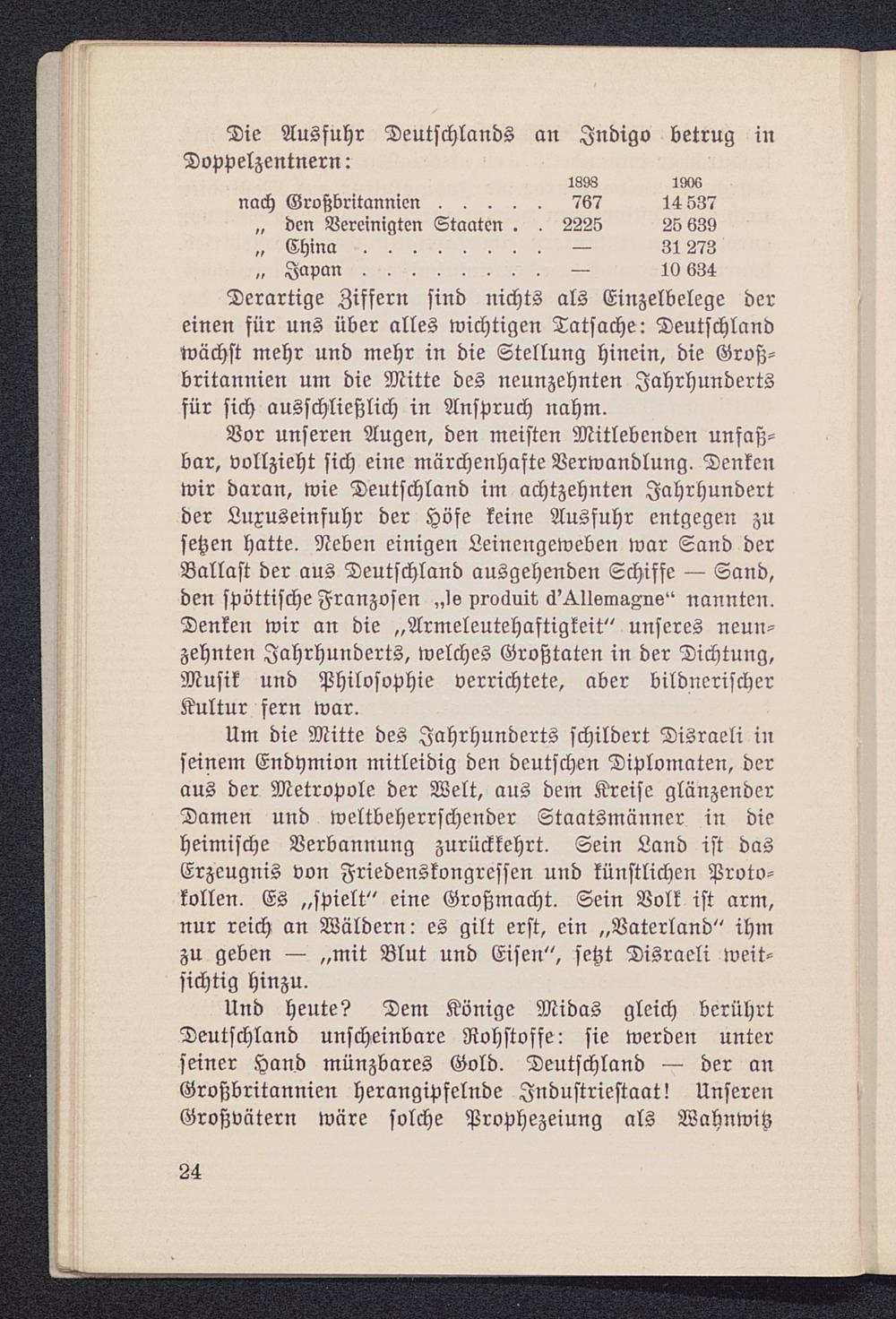 Derartige Ziffern sind nichts als Einzelbelege dereinen für uns über alles wichtigen Tatsache: Deutschland wächst mehr und mehr in die Stellung hinein, die Groß-britannien um die Mitte des neunzehnten Jahrhundertsfür sich ausschließlich in Anspruch nahm.