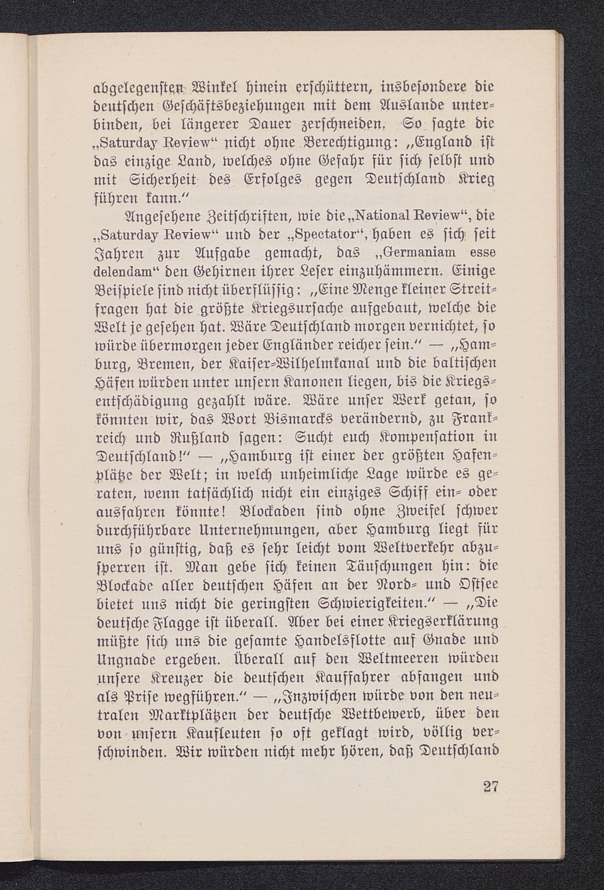 Angesehene Zeitschriften, wie die „Rational Rsviov", die„Saturäa^ Kovisv" und der „8psetatoi^, haben es sich seitJahren zur Aufgabe gemacht, das „6wrinania,n sssoäolenllain" den Gehirnen ihrer Leser einzuhämmern. EinigeBeispiele sind nicht überflüssig: „Eine Menge kleiner Streit-fragen hat die größte Kriegsursache aufgebaut, welche dieWelt je gesehen hat. Wäre Deutschland morgen vernichtet, sowürde übermorgen jeder Engländer reicher sein." — „Ham-burg, Bremen , der Kaiser-Wilhelmkanal und die baltischenHäfen würden unter unsern Kanonen liegen, bis die Kriegs-entschädigung gezahlt wäre. Wäre unser Werk getan, sokönnten wir, das Wort Bismarcks verändernd, zu Frank-reich und Rußland sagen: Sucht euch Kompensation inDeutschland!" — „Hamburg ist einer der größten Hafen-plätze der Welt; in welch unheimliche Lage würde es ge-raten, wenn tatsächlich nicht ein einziges Schiff ein- oderausfahren könnte! Blockaden sind ohne Zweifel schwerdurchführbare Unternehmungen, aber Hamburg liegt füruns so günstig, daß es sehr leicht vom Weltverkehr abzu-sperren ist. Man gebe sich keinen Täuschungen hin: dieBlockade aller deutschen Häfen an der Nord- und Ostsee bietet uns nicht die geringsten Schwierigkeiten." — „Diedeutsche Flagge ist überall. Wer bei einer Kriegserklärungmüßte sich uns die gesamte Handelsflotte auf Gnade undUngnade ergeben. Überall auf den Weltmeeren würdenunsere Kreuzer die deutschen Kauffahrer abfangen undals Prise wegführen." — „Inzwischen würde von den neu-tralen Marktplätzen der deutsche Wettbewerb, über denvon unsern Kaufleuten so oft geklagt wird, völlig ver-schwinden. Wir würden nicht mehr hören, daß Deutschland