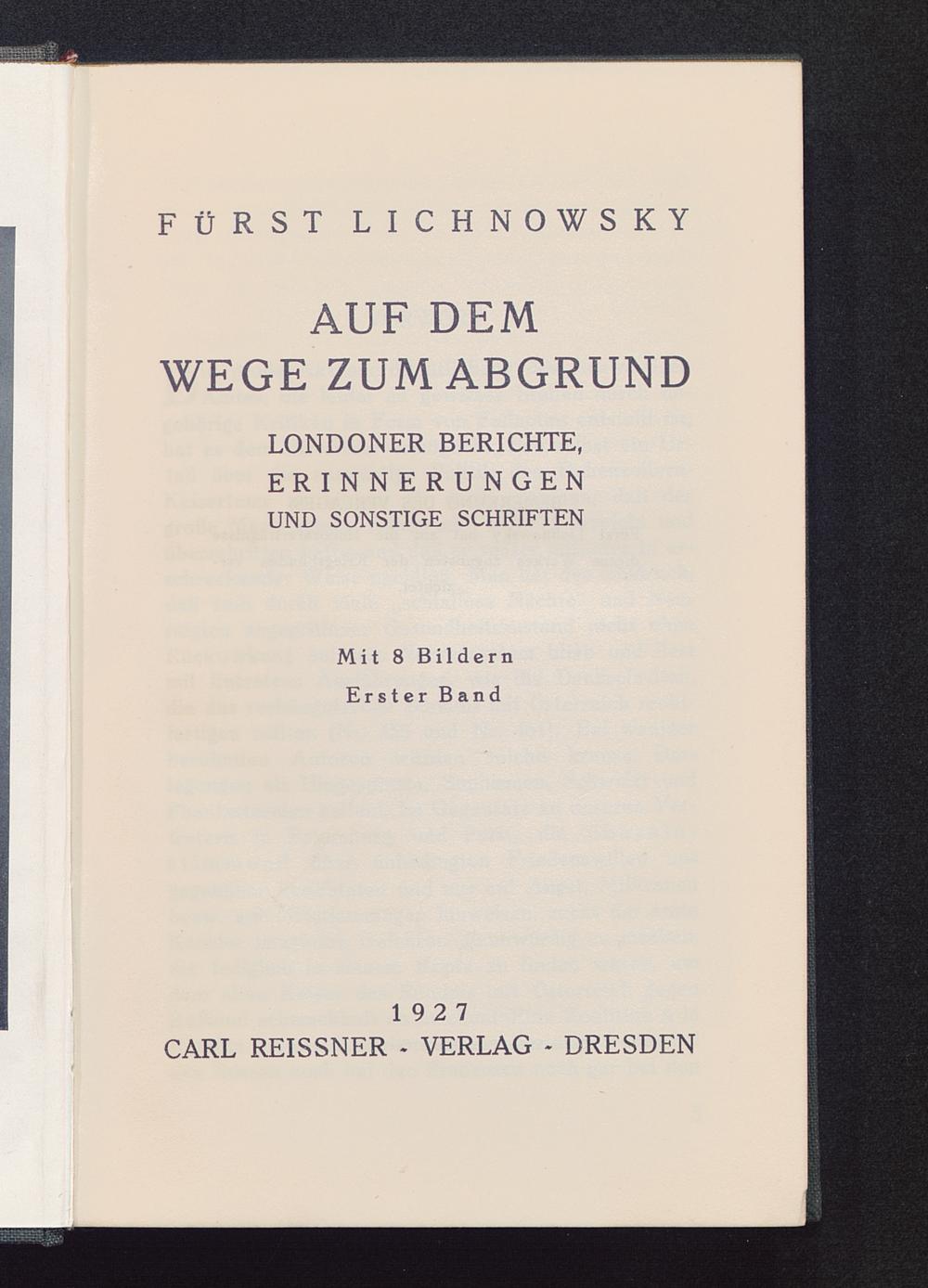 FÜRST LICHNOWSKYAUF DEMWEGE ZUM ABGRUNDLONDONER BERICHTE,ERINNERUNGENUND SONSTIGE SCHRIFTENMit 8 BildernErster Band19 2 7CARL REISSNER - VERLAG - DRESDEN