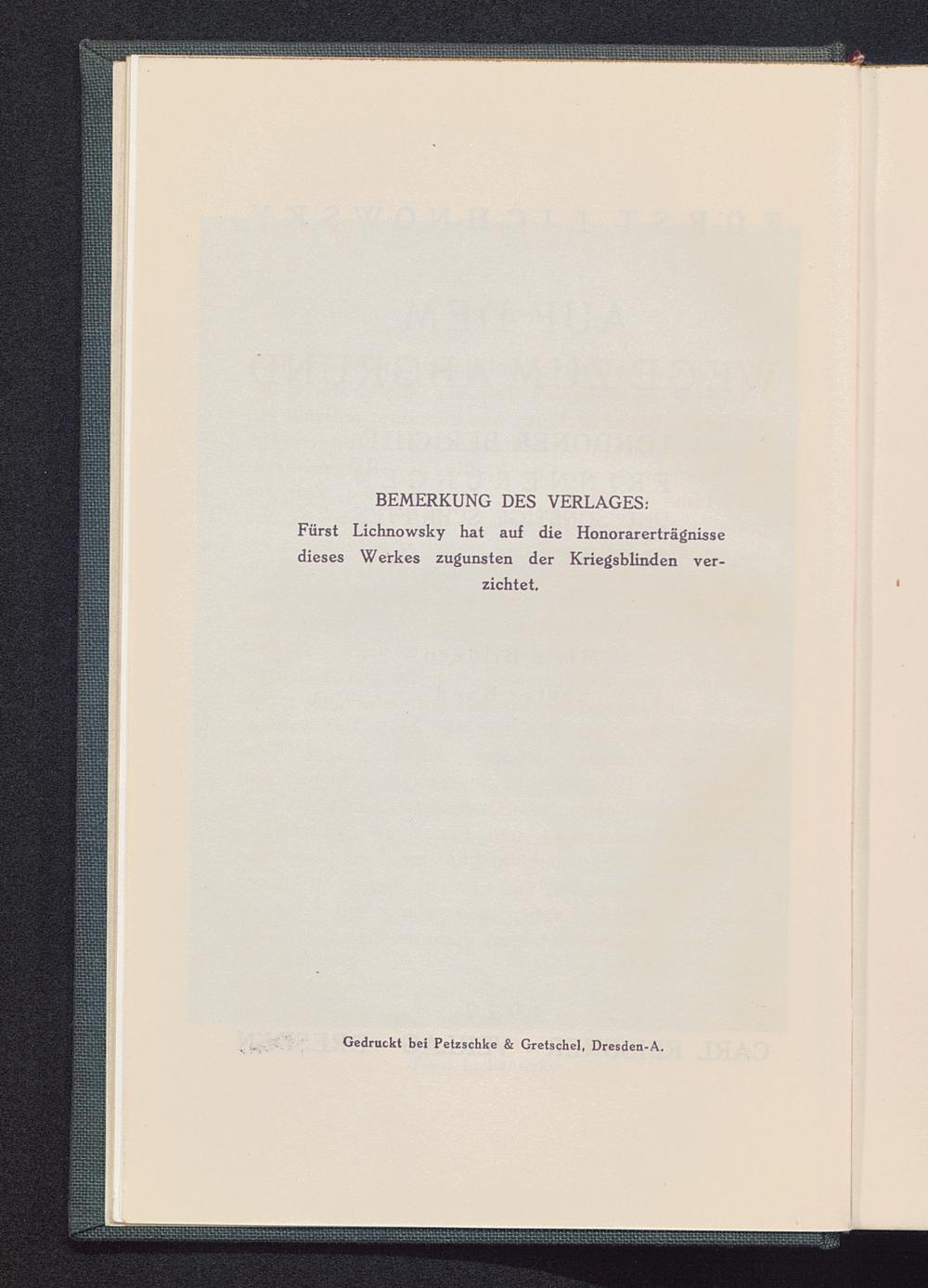 Fürst Lichnowsky hat auf die Honorarerträgnissedieses Werkes zugunsten der Kriegsblinden ver-zichtet.