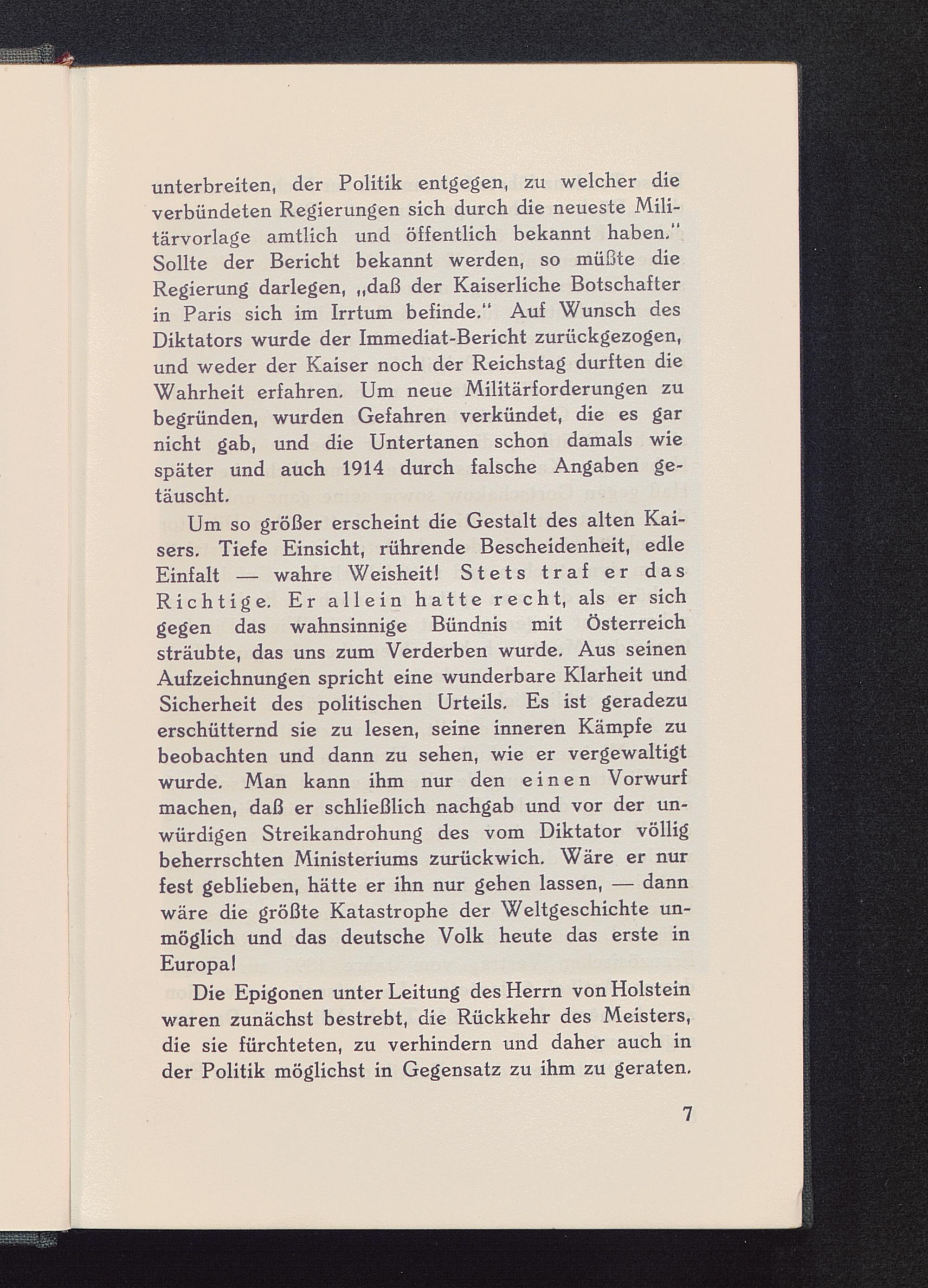 Die Epigonen unter Leitung des Herrn von Holsteinwaren zunächst bestrebt, die Rückkehr des Meisters,die sie fürchteten, zu verhindern und daher auch inder Politik möglichst in Gegensatz zu ihm zu geraten.