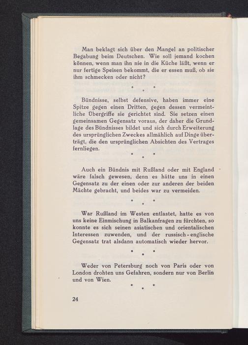 Auch ein Bündnis mit Rußland oder mit England •wäre falsch gewesen, denn es hätte uns in einenGegensatz zu der einen oder zur anderen der beidenMächte gebracht, und beides war zu vermeiden.