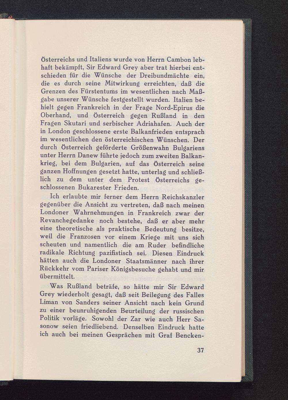 Österreichs und Italiens wurde von Herrn Cambon leb-haft bekämpft, Sir Edward Grey aber trat hierbei ent-schieden für die Wünsche der Dreibundmächte ein,die es durch seine Mitwirkung erreichten, daß dieGrenzen des Fürstentums im wesentlichen nach Maß-gabe unserer Wünsche festgestellt wurden. Italien be-hielt gegen Frankreich in der Frage Nord-Epirus dieOberhand, und Österreich gegen Rußland in denFragen Skutari und serbischer Adriahafen. Auch derin London geschlossene erste Balkanfrieden entsprachim wesentlichen den österreichischen Wünschen. Derdurch Österreich geförderte Größenwahn Bulgariens unter Herrn Danew führte jedoch zum zweiten Balkan-krieg, bei dem Bulgarien, auf das Österreich seineganzen Hoffnungen gesetzt hatte, unterlag und schließ-lich zu dem unter dem Protest Österreichs ge-schlossenen Bukarester Frieden.