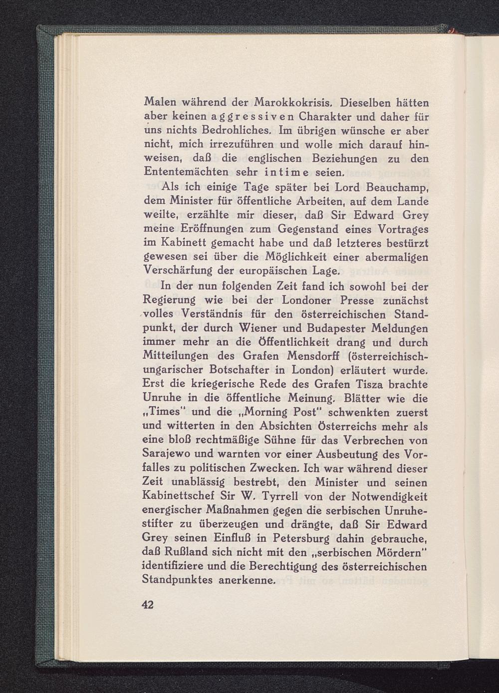 In der nun folgenden Zeit fand ich sowohl bei derRegierung wie bei der Londoner Presse zunächstvolles Verständnis für den österreichischen Stand-punkt, der durch Wiener und Budapester Meldungenimmer mehr an die Öffentlichkeit drang und durchMitteilungen des Grafen Mensdorff (österreichisch-ungarischer Botschafter in London) erläutert wurde.Erst die kriegerische Rede des Grafen Tisza brachteUnruhe in die öffentliche Meinung. Blätter wie die„Times" und die „Morning Post“ schwenkten zuerstund witterten in den Absichten Österreichs mehr alseine bloß rechtmäßige Sühne für das Verbrechen vonSarajewo und warnten vor einer Ausbeutung des Vor-falles zu politischen Zwecken. Ich war während dieserZeit unablässig bestrebt, den Minister und seinenKabinettschef Sir W. Tyrrell von der Notwendigkeitenergischer Maßnahmen gegen die serbischen Unruhe-stifter zu überzeugen und drängte, daß Sir EdwardGrey seinen Einfluß in Petersburg dahin gebrauche,daß Rußland sich nicht mit den „serbischen Mördern“identifiziere und die Berechtigung des österreichischenStandpunktes anerkenne.