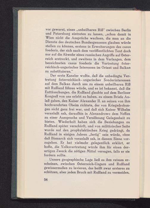 vor gewarnt, einen „unheilbaren Riß“ zwischen Berlin und Petersburg eintreten zu lassen, „schon damit inWien nicht die Ansprüche wachsen, die man an dieDienste des deutschen Bundesgenossen glauben würdestellen zu können, erstens in Erweiterungen des casusfoederis, der sich nach dem veröffentlichten Text dochnur auf die Abwehr eines russischen Angriffs auf Öster-reich erstreckt, und zweitens in dem Verlangen, dembezeichneten casus foederis die Vertretung öster-reichisch-ungarischer Interessen im Orient und Balkan zu substituieren."
