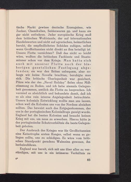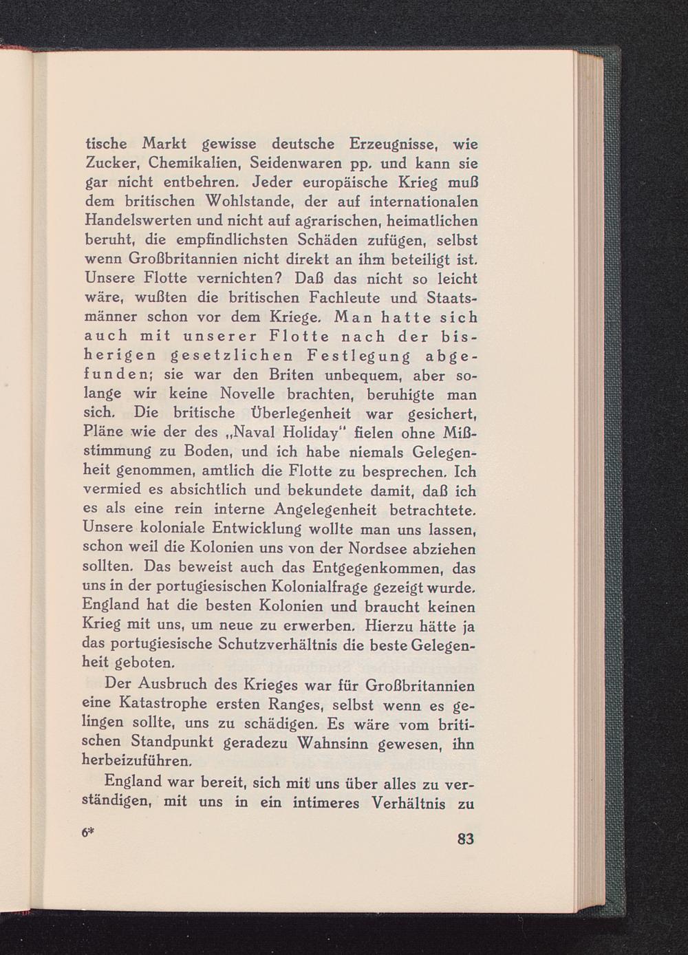 tische Markt gewisse deutsche Erzeugnisse, wieZucker, Chemikalien, Seidenwaren pp, und kann siegar nicht entbehren. Jeder europäische Krieg mußdem britischen Wohlstände, der auf internationalenHandelswerten und nicht auf agrarischen, heimatlichenberuht, die empfindlichsten Schäden zufügen, selbstwenn Großbritannien nicht direkt an ihm beteiligt ist.Unsere Flotte vernichten? Daß das nicht so leichtwäre, wußten die britischen Fachleute und Staats-männer schon vor dem Kriege. Man hatte sichauch mit unserer Flotte nach der bis-herigen gesetzlichen Festlegung abge-funden; sie war den Briten unbequem, aber so-lange wir keine Novelle brachten, beruhigte mansich. Die britische Überlegenheit war gesichert,Pläne wie der des „Naval Holiday“ fielen ohne Miß-stimmung zu Boden, und ich habe niemals Gelegen-heit genommen, amtlich die Flotte zu besprechen. Ichvermied es absichtlich und bekundete damit, daß iches als eine rein interne Angelegenheit betrachtete.Unsere koloniale Entwicklung wollte man uns lassen,schon weil die Kolonien uns von der Nordsee abziehensollten. Das beweist auch das Entgegenkommen, dasuns in der portugiesischen Kolonialfrage gezeigt wurde.England hat die besten Kolonien und braucht keinenKrieg mit uns, um neue zu erwerben. Hierzu hätte jadas portugiesische Schutzverhältnis die beste Gelegen-heit geboten.