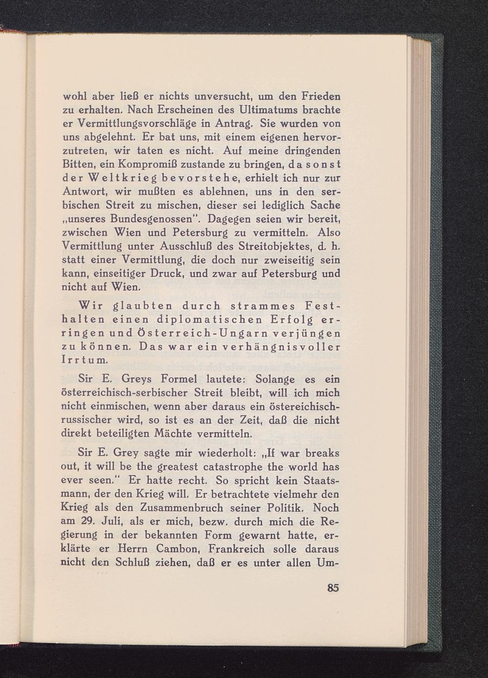 Sir E. Greys Formel lautete: Solange es einösterreichisch-serbischer Streit bleibt, will ich michnicht einmischen, wenn aber daraus ein östereichisch-russischer wird, so ist es an der Zeit, daß die nichtdirekt beteiligten Mächte vermitteln.