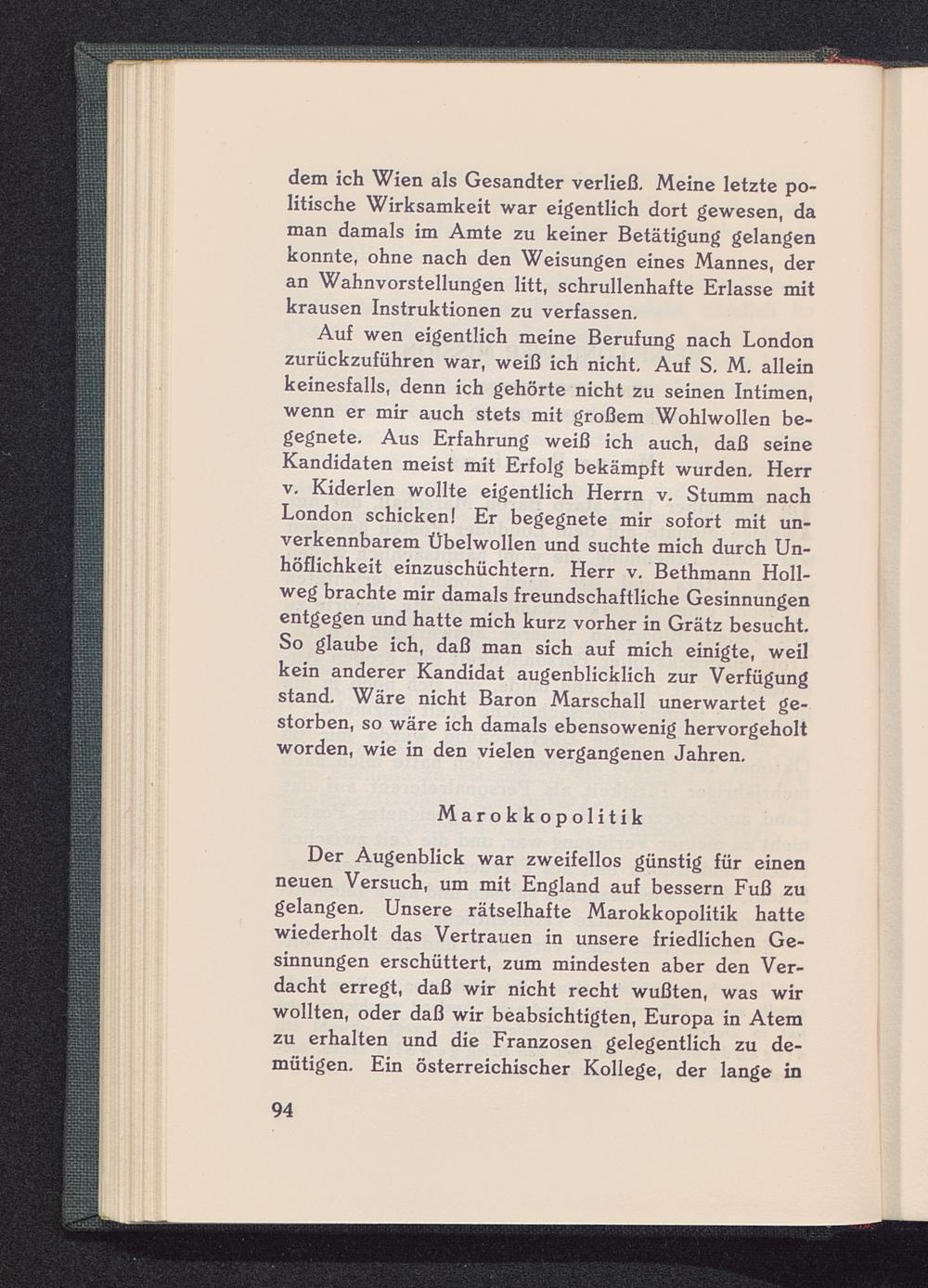 Auf wen eigentlich meine Berufung nach London zurückzuführen war, weiß ich nicht. Auf S. M. alleinkeinesfalls, denn ich gehörte nicht zu seinen Intimen,wenn er mir auch stets mit großem Wohlwollen be-gegnete. Aus Erfahrung weiß ich auch, daß seineKandidaten meist mit Erfolg bekämpft wurden. Herrv. Kiderlen wollte eigentlich Herrn v. Stumm nachLondon schicken! Er begegnete mir sofort mit un-verkennbarem Übelwollen und suchte mich durch Un-höflichkeit einzuschüchtern. Herr v. Bethmann Holl-weg brachte mir damals freundschaftliche Gesinnungenentgegen und hatte mich kurz vorher in Grätz besucht.So glaube ich, daß man sich auf mich einigte, weilkein anderer Kandidat augenblicklich zur Verfügungstand. Wäre nicht Baron Marschall unerwartet ge-storben, so wäre ich damals ebensowenig hervorgeholtworden, wie in den vielen vergangenen Jahren.