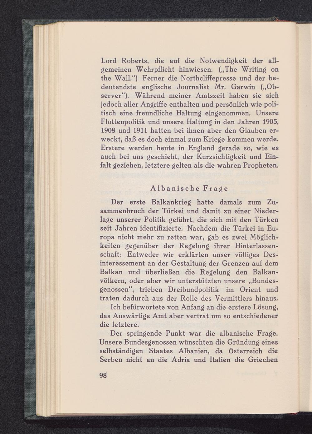 Lord Roberts , die auf die Notwendigkeit der all-gemeinen Wehrpflicht hinwiesen. („The Writing onthe Wall.“) Ferner die Northcliffepresse und der be-deutendste englische Journalist Mr, Garwin („Ob-server“). Während meiner Amtszeit haben sie sichjedoch aller Angriffe enthalten und persönlich wie poli-tisch eine freundliche Haltung eingenommen. UnsereFlottenpolitik und unsere Haltung in den Jahren 1905,1908 und 1911 hatten bei ihnen aber den Glauben er-weckt, daß es doch einmal zum Kriege kommen werde.Erstere werden heute in England gerade so, wie esauch bei uns geschieht, der Kurzsichtigkeit und Ein-falt geziehen, letztere gelten als die wahren Propheten.