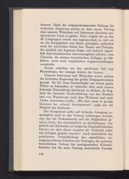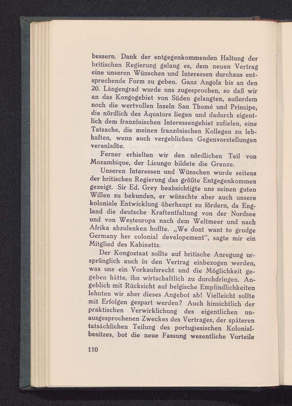 Unseren Interessen und Wünschen wurde seitensder britischen Regierung das größte Entgegenkommengezeigt. Sir Ed. Grey beabsichtigte uns seinen gutenWillen zu bekunden, er wünschte aber auch unserekoloniale Entwicklung überhaupt zu fördern, da Eng-land die deutsche Kraftentfaltung von der Nordsee und von Westeuropa nach dem Weltmeer und nachAfrika abzulenken hoffte. „We dont want to grudgeGermany her colonial developement", sagte mir einMitglied des Kabinetts.