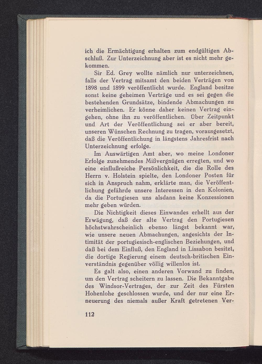 Sir Ed. Grey wollte nämlich nur unterzeichnen,falls der Vertrag mitsamt den beiden Verträgen von1898 und 1899 veröffentlicht wurde. England besitzesonst keine geheimen Verträge und es sei gegen diebestehenden Grundsätze, bindende Abmachungen zuverheimlichen. Er könne daher keinen Vertrag ein-gehen, ohne ihn zu veröffentlichen. Über Zeitpunktund Art der Veröffentlichung sei er aber bereit,unseren Wünschen Rechnung zu tragen, vorausgesetzt,daß die Veröffentlichung in längstens Jahresfrist nachUnterzeichnung erfolge.