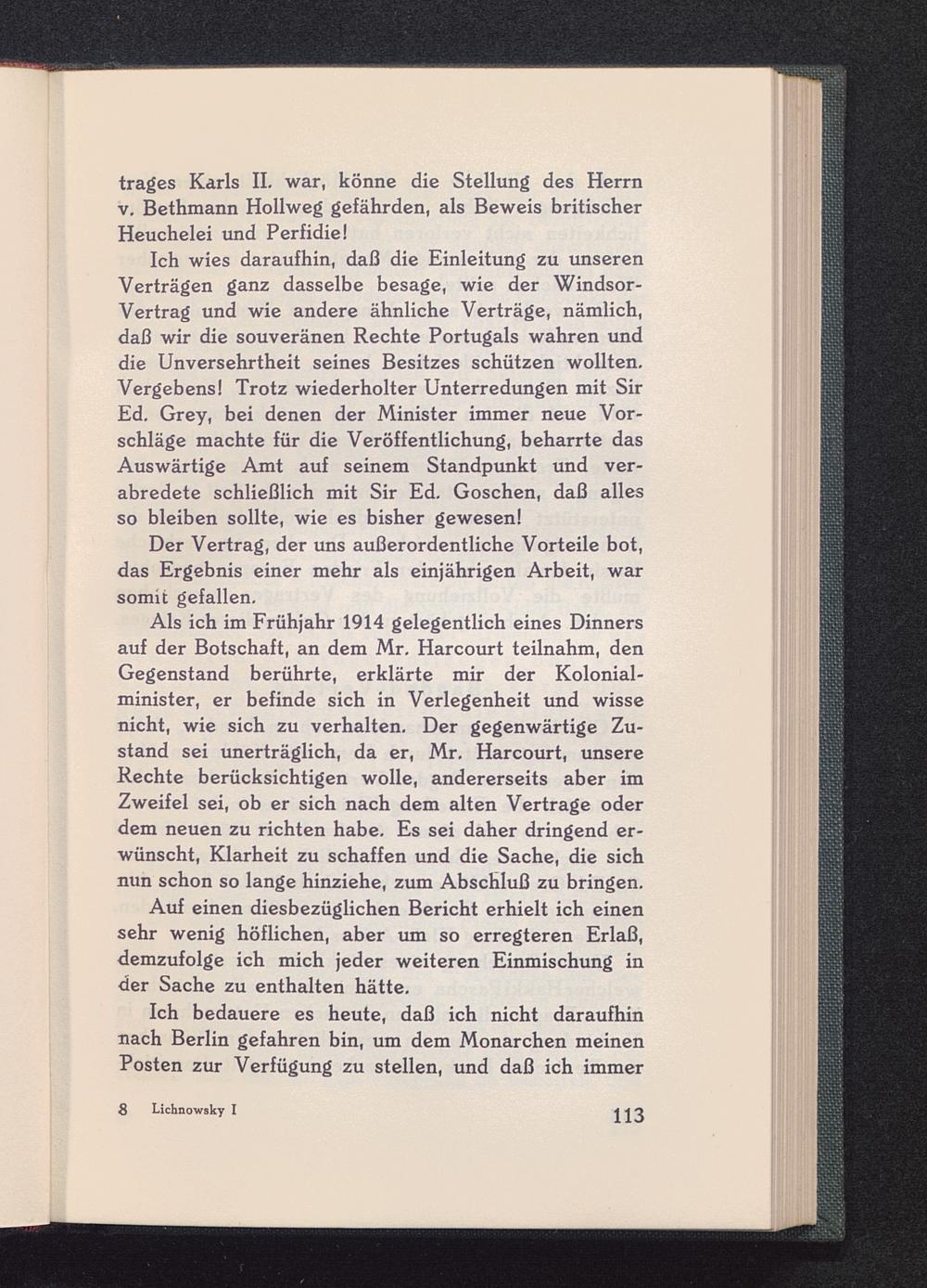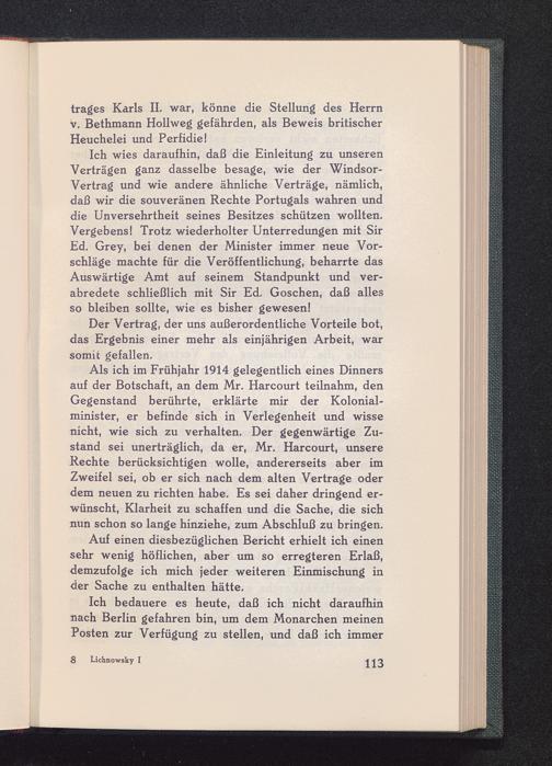 Als ich im Frühjahr 1914 gelegentlich eines Dinnersauf der Botschaft, an dem Mr. Harcourt teilnahm, denGegenstand berührte, erklärte mir der Kolonial-minister, er befinde sich in Verlegenheit und wissenicht, wie sich zu verhalten. Der gegenwärtige Zu-stand sei unerträglich, da er, Mr. Harcourt, unsereRechte berücksichtigen wolle, andererseits aber imZweifel sei, ob er sich nach dem alten Vertrage oderdem neuen zu richten habe. Es sei daher dringend er-wünscht, Klarheit zu schaffen und die Sache, die sichnun schon so lange hinziehe, zum Abschluß zu bringen.