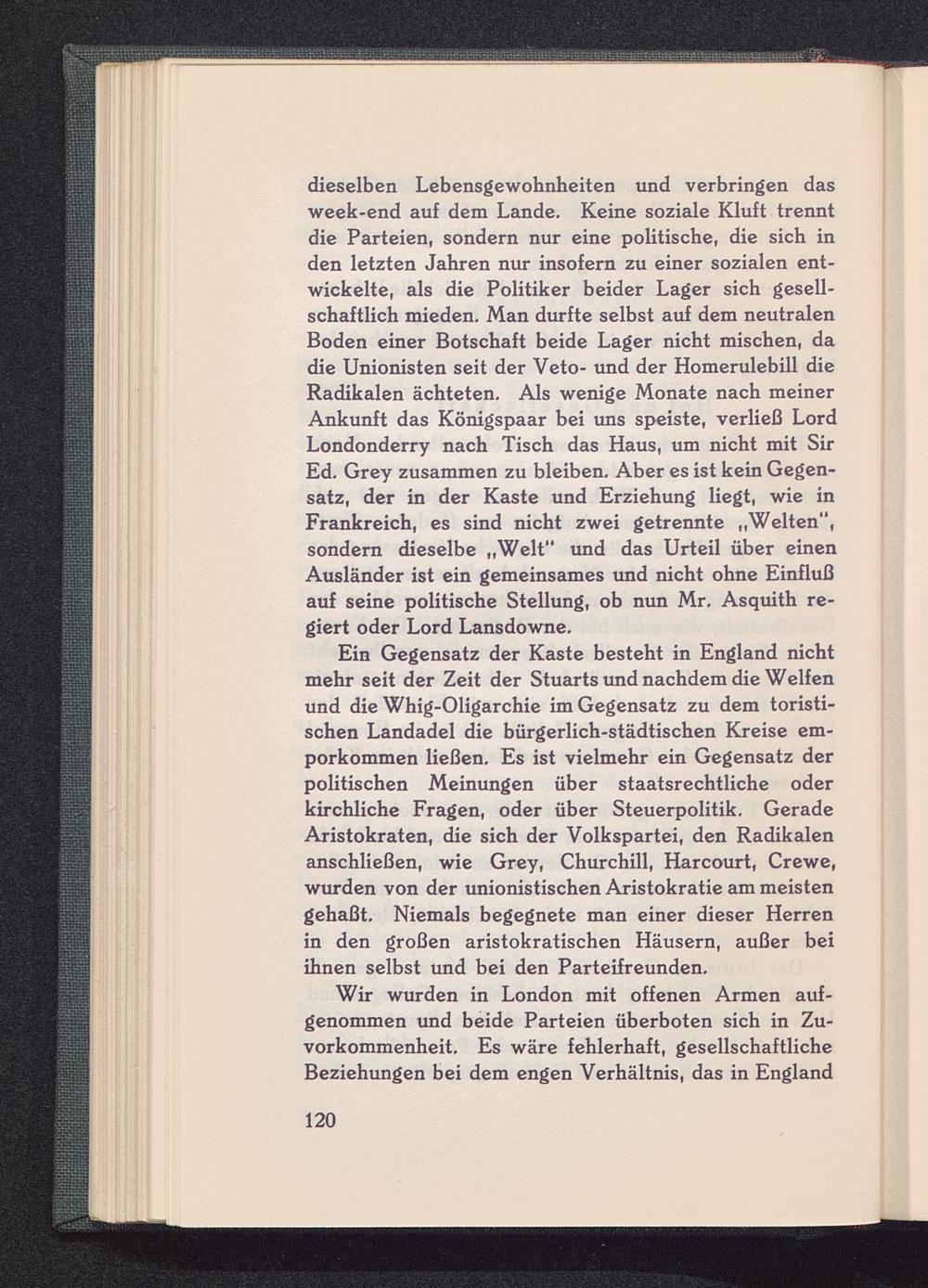 Ein Gegensatz der Kaste besteht in England nichtmehr seit der Zeit der Stuarts und nachdem die Welfenund die Whig-Oligarchie im Gegensatz zu dem toristi-schen Landadel die bürgerlich-städtischen Kreise em-porkommen ließen. Es ist vielmehr ein Gegensatz derpolitischen Meinungen über staatsrechtliche oderkirchliche Fragen, oder über Steuerpolitik. GeradeAristokraten, die sich der Volkspartei, den Radikalenanschließen, wie Grey, Churchill , Harcourt, Crewe,wurden von der unionistischen Aristokratie am meistengehaßt. Niemals begegnete man einer dieser Herrenin den großen aristokratischen Häusern, außer beiihnen selbst und bei den Parteifreunden.