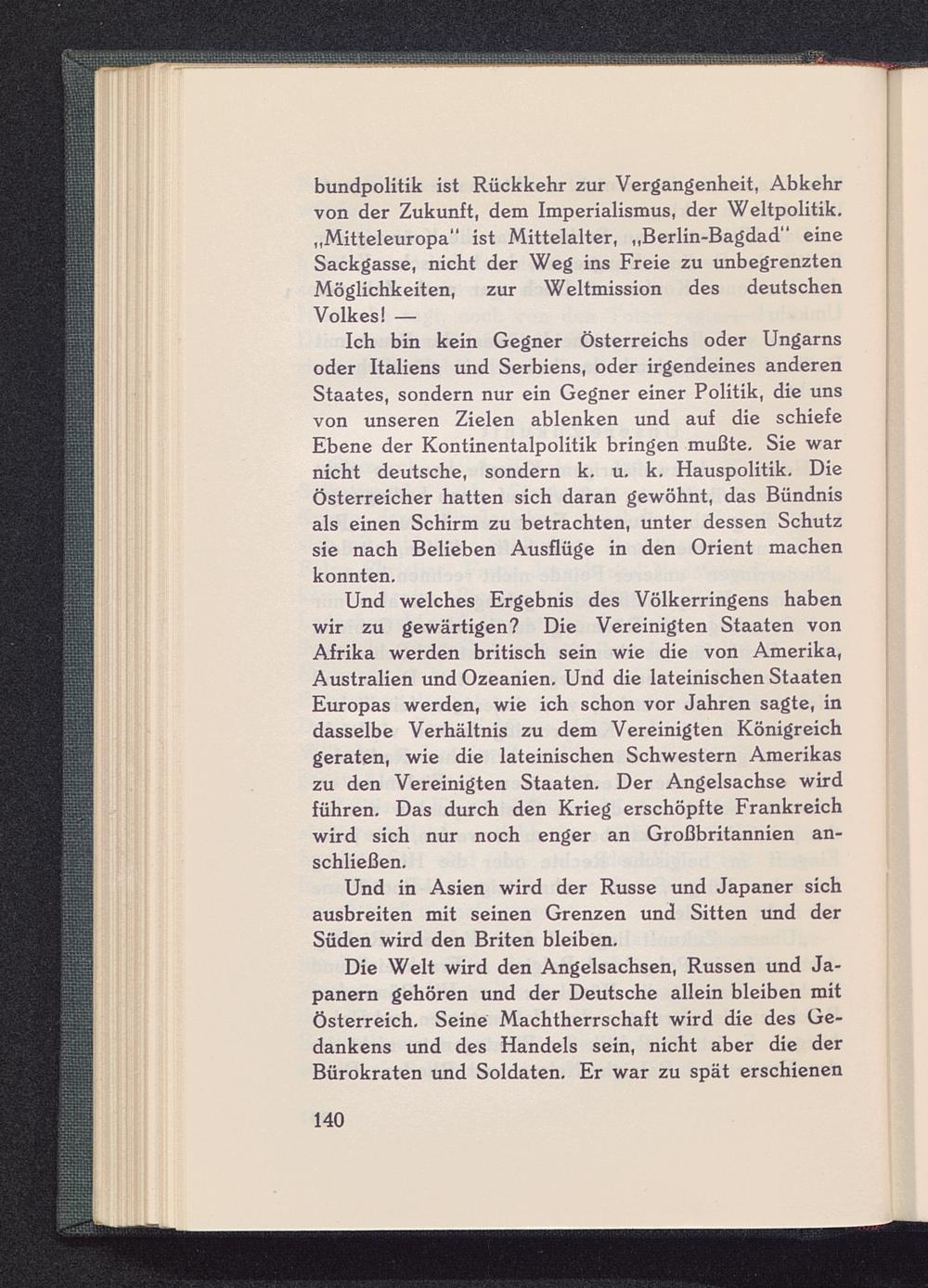 bundpolitik ist Rückkehr zur Vergangenheit, Abkehrvon der Zukunft, dem Imperialismus, der Weltpolitik.„Mitteleuropa“ ist Mittelalter, „Berlin-Bagdad “ eineSackgasse, nicht der Weg ins Freie zu unbegrenztenMöglichkeiten, zur Weltmission des deutschenVolkes! —