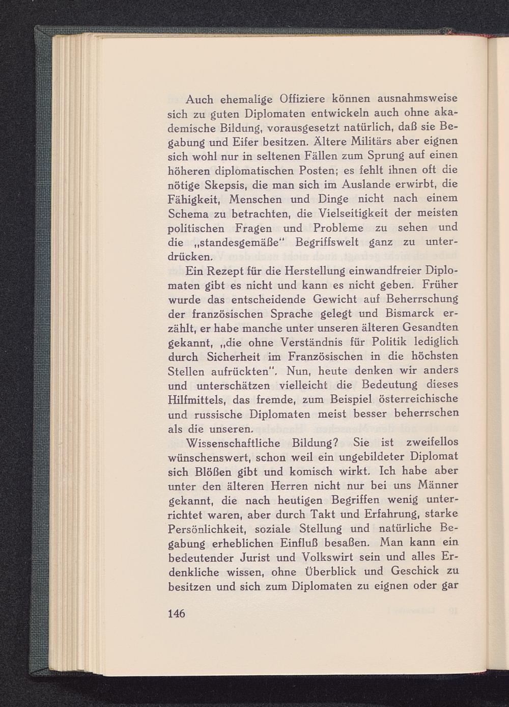 Auch ehemalige Offiziere können ausnahmsweisesich zu guten Diplomaten entwickeln auch ohne aka-demische Bildung, vorausgesetzt natürlich, daß sie Be-gabung und Eifer besitzen. Ältere Militärs aber eignensich wohl nur in seltenen Fällen zum Sprung auf einenhöheren diplomatischen Posten; es fehlt ihnen oft dienötige Skepsis, die man sich im Auslande erwirbt, dieFähigkeit, Menschen und Dinge nicht nach einemSchema zu betrachten, die Vielseitigkeit der meistenpolitischen Fragen und Probleme zu sehen unddie „standesgemäße" Begriffswelt ganz zu unter-drücken.