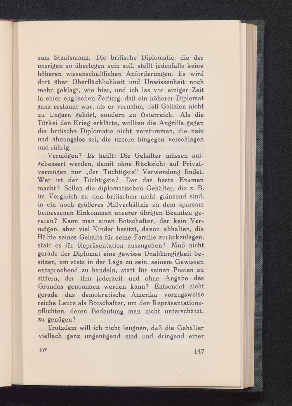 zum Staatsmann. Die britische Diplomatie, die derunsrigen so überlegen sein soll, stellt jedenfalls keinehöheren wissenschaftlichen Anforderungen. Es wirddort über Oberflächlichkeit und Unwissenheit nochmehr geklagt, wie hier, und ich las vor einiger Zeitin einer englischen Zeitung, daß ein höherer Diplomatganz erstaunt war, als er vernahm, daß Galizien nichtzu Ungarn gehört, sondern zu Österreich . Als dieTürkei den Krieg erklärte, wollten die Angriffe gegendie britische Diplomatie nicht verstummen, die naivund ahnungslos sei, die unsere hingegen verschlagenund rührig.