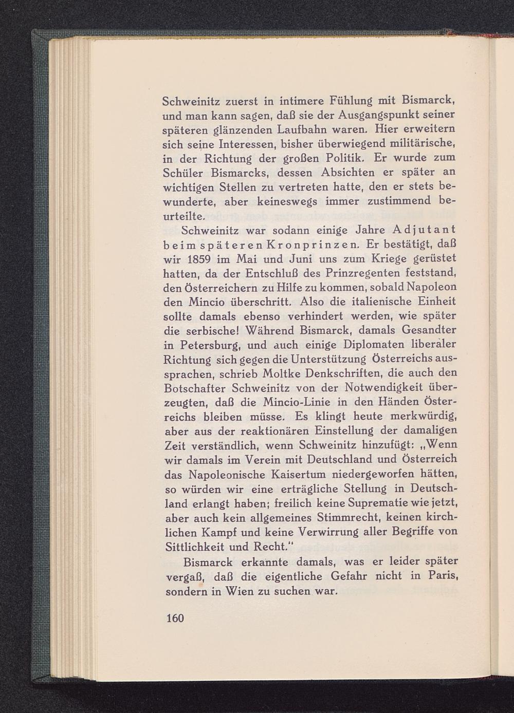 Schweinitz war sodann einige Jahre Adjutantbeim späteren Kronprinzen. Er bestätigt, daßwir 1859 im Mai und Juni uns zum Kriege gerüstethatten, da der Entschluß des Prinzregenten feststand,den Österreichern zu Hilfe zu kommen, sobald Napoleonden Mincio überschritt. Also die italienische Einheitsollte damals ebenso verhindert werden, wie späterdie serbische! Während Bismarck, damals Gesandterin Petersburg, und auch einige Diplomaten liberalerRichtung sich gegen die Unterstützung Österreichs aus-sprachen, schrieb Moltke Denkschriften, die auch denBotschafter Schweinitz von der Notwendigkeit über-zeugten, daß die Mincio-Linie in den Händen Öster-reichs bleiben müsse. Es klingt heute merkwürdig,aber aus der reaktionären Einstellung der damaligenZeit verständlich, wenn Schweinitz hinzufügt: „Wennwir damals im Verein mit Deutschland und Österreich das Napoleonische Kaisertum niedergeworfen hätten,so würden wir eine erträgliche Stellung in Deutsch-land erlangt haben; freilich keine Suprematie wie jetzt,aber auch kein allgemeines Stimmrecht, keinen kirch-lichen Kampf und keine Verwirrung aller Begriffe vonSittlichkeit und Recht."