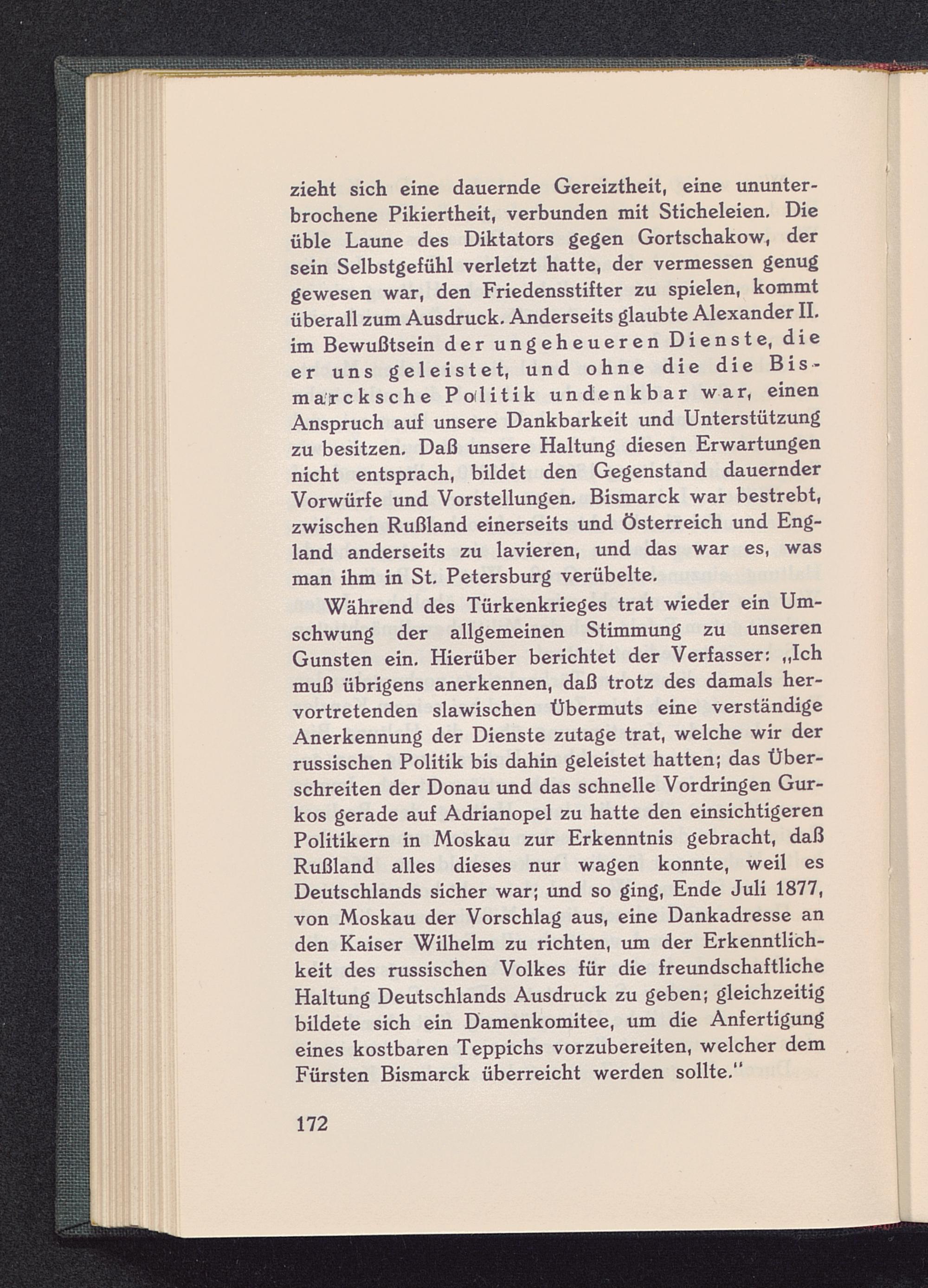 Während des Türkenkrieges trat wieder ein Um-schwung der allgemeinen Stimmung zu unserenGunsten ein. Hierüber berichtet der Verfasser: „Ichmuß übrigens anerkennen, daß trotz des damals her-vortretenden slawischen Übermuts eine verständigeAnerkennung der Dienste zutage trat, welche wir derrussischen Politik bis dahin geleistet hatten; das Über-schreiten der Donau und das schnelle Vordringen Gur-kos gerade auf Adrianopel zu hatte den einsichtigerenPolitikern in Moskau zur Erkenntnis gebracht, daßRußland alles dieses nur wagen konnte, weil esDeutschlands sicher war; und so ging, Ende Juli 1877,von Moskau der Vorschlag aus, eine Dankadresse anden Kaiser Wilhelm zu richten, um der Erkenntlich-keit des russischen Volkes für die freundschaftlicheHaltung Deutschlands Ausdruck zu geben; gleichzeitigbildete sich ein Damenkomitee, um die Anfertigungeines kostbaren Teppichs vorzubereiten, welcher demFürsten Bismarck überreicht werden sollte."