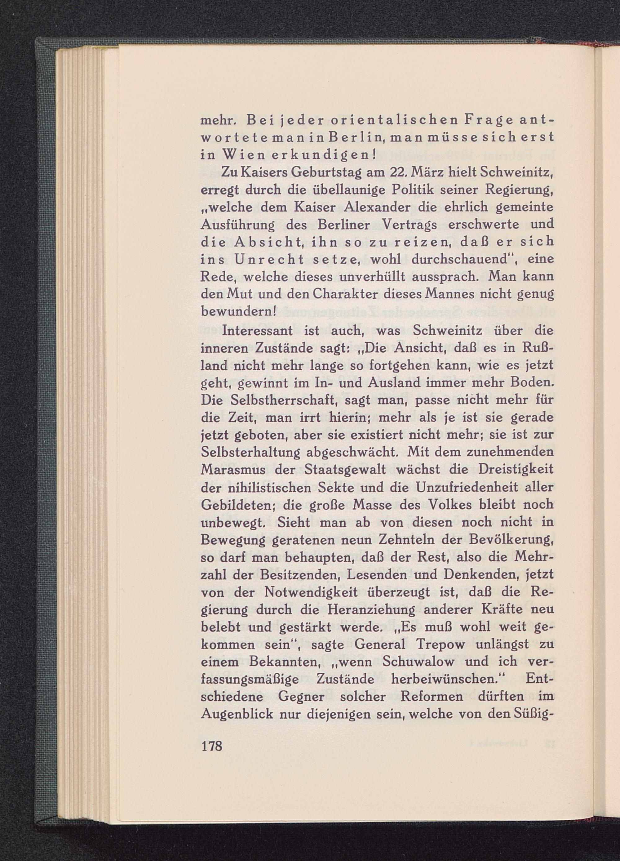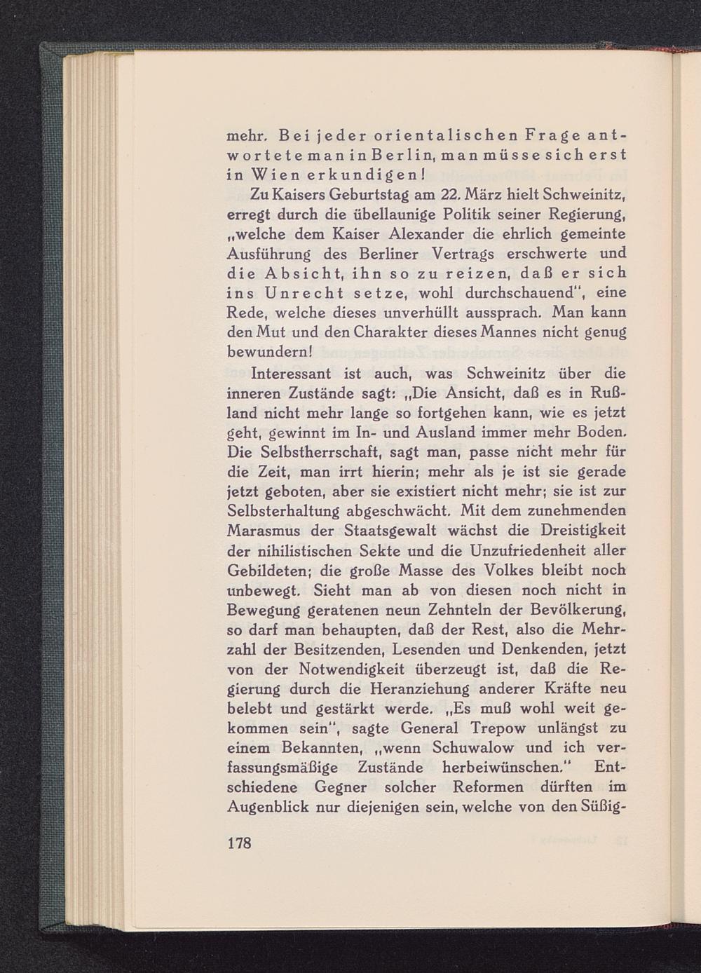 Zu Kaisers Geburtstag am 22, März hielt Schweinitz,erregt durch die übellaunige Politik seiner Regierung,„welche dem Kaiser Alexander die ehrlich gemeinteAusführung des Berliner Vertrags erschwerte unddie Absicht, ihn so zu reizen, daß er sichins Unrecht setze, wohl durchschauend", eineRede, welche dieses unverhüllt aussprach. Man kannden Mut und den Charakter dieses Mannes nicht genugbewundern!