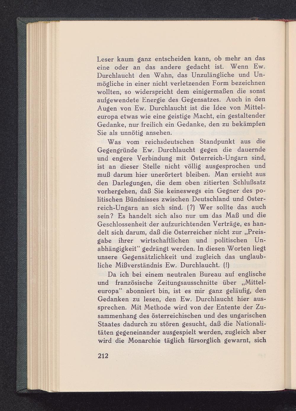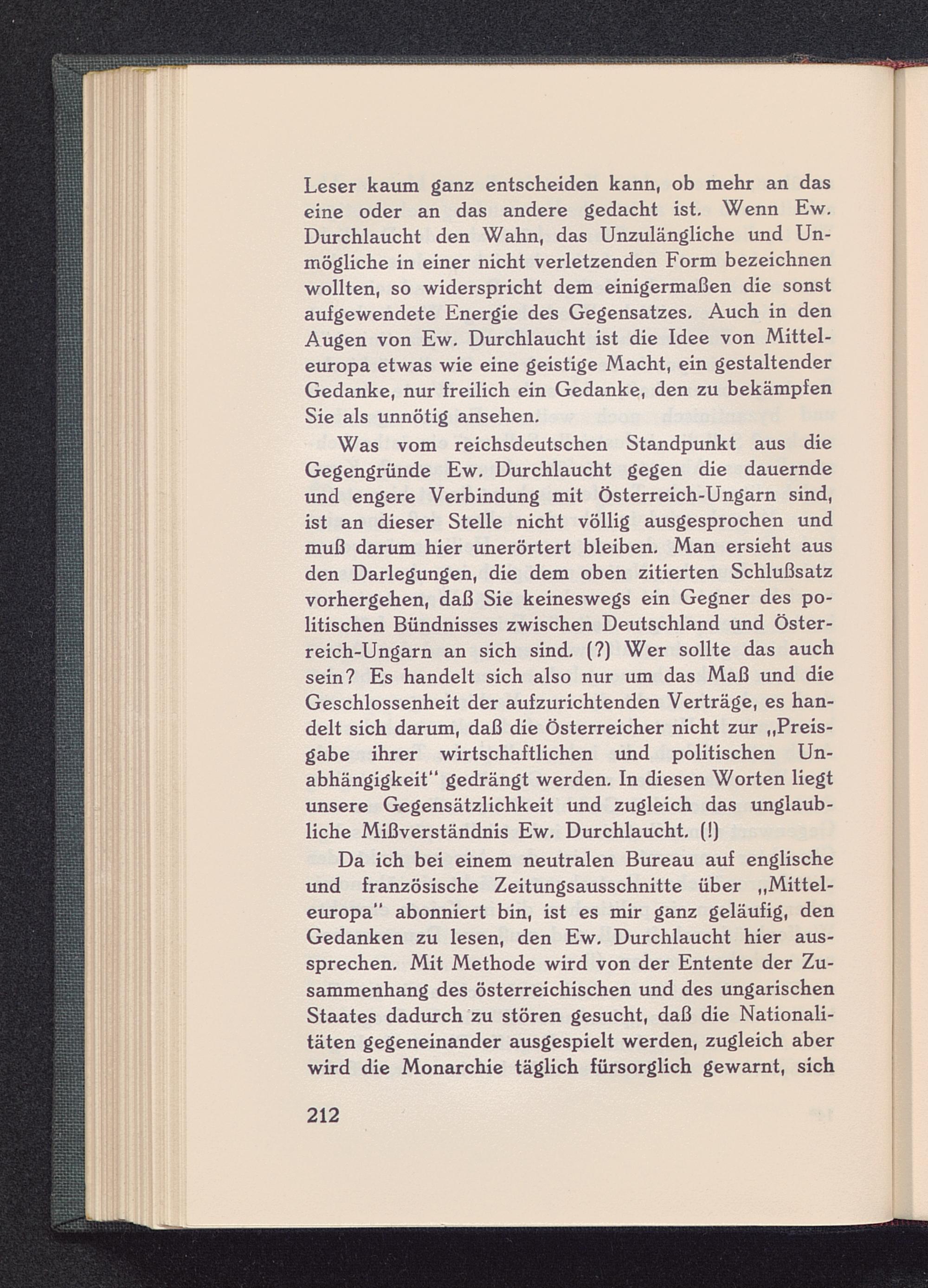 Leser kaum ganz entscheiden kann, ob mehr an daseine oder an das andere gedacht ist. Wenn Ew.Durchlaucht den Wahn, das Unzulängliche und Un-mögliche in einer nicht verletzenden Form bezeichnenwollten, so widerspricht dem einigermaßen die sonstaufgewendete Energie des Gegensatzes. Auch in denAugen von Ew. Durchlaucht ist die Idee von Mittel-europa etwas wie eine geistige Macht, ein gestaltenderGedanke, nur freilich ein Gedanke, den zu bekämpfenSie als unnötig ansehen.