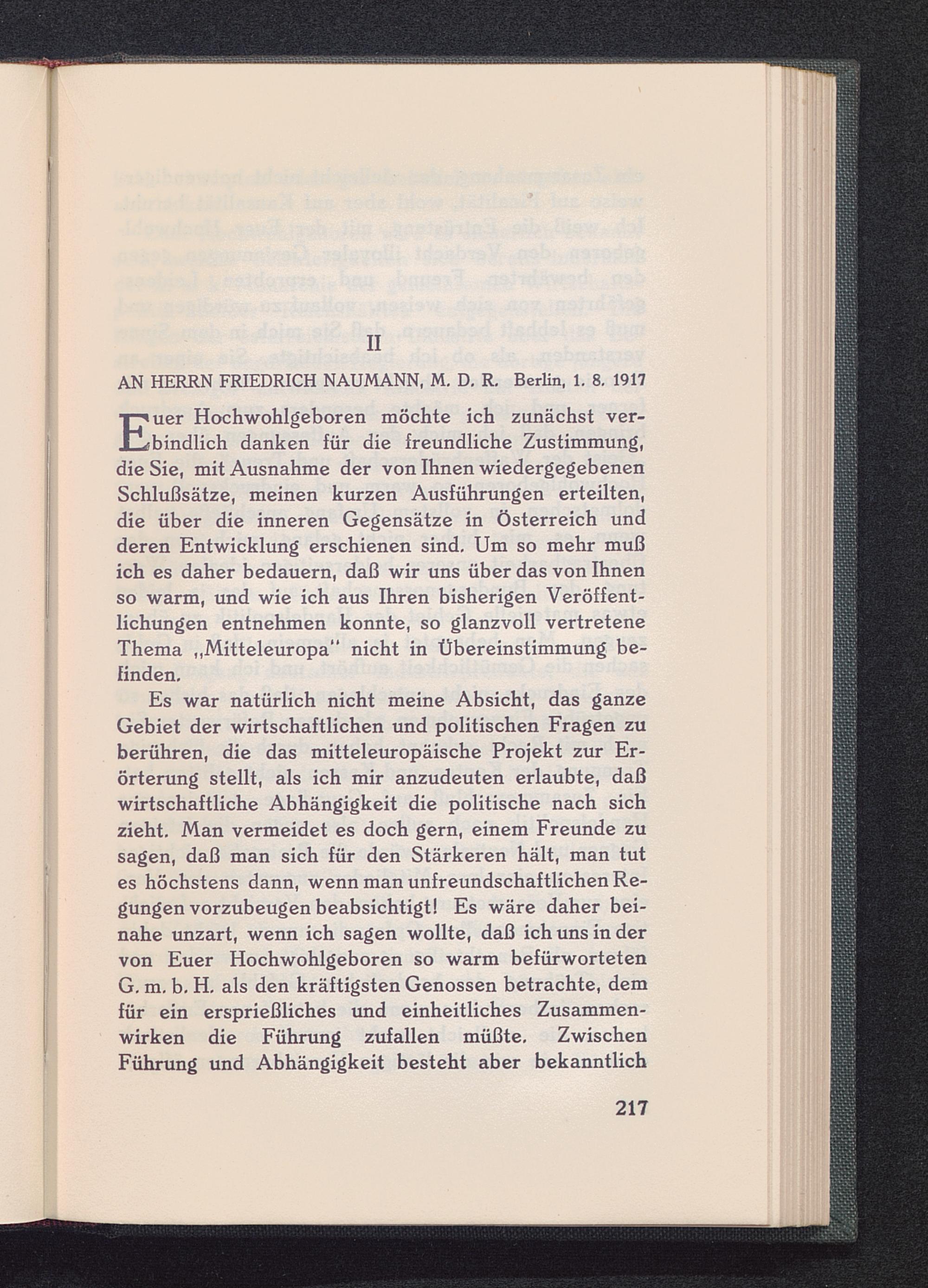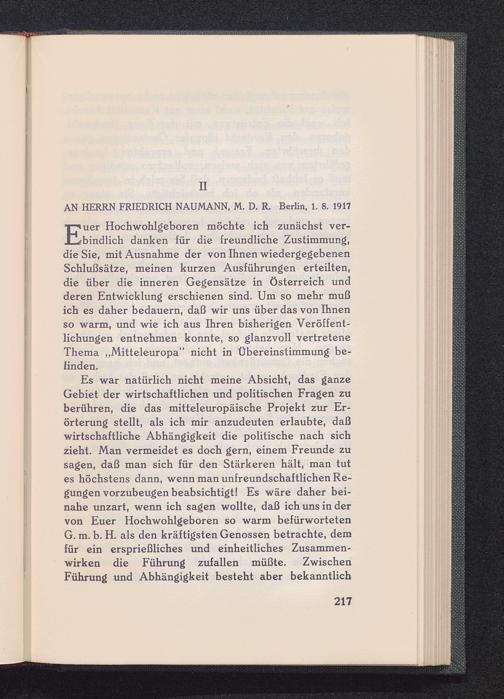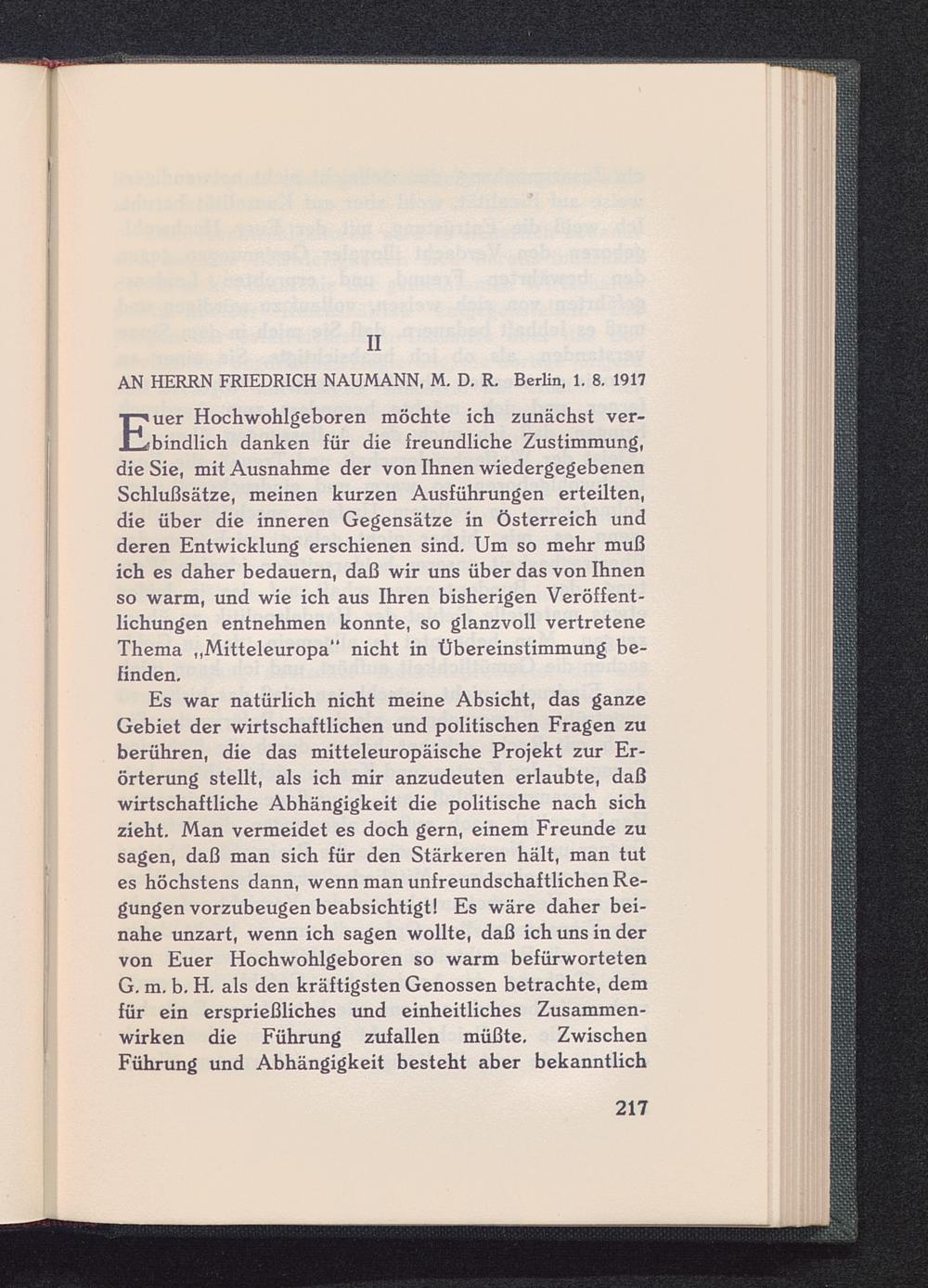 E uer Hochwohlgeboren möchte ich zunächst ver-bindlich danken für die freundliche Zustimmung,die Sie, mit Ausnahme der von Ihnen wiedergegebenenSchlußsätze, meinen kurzen Ausführungen erteilten,die über die inneren Gegensätze in Österreich undderen Entwicklung erschienen sind. Um so mehr mußich es daher bedauern, daß wir uns über das von Ihnenso warm, und wie ich aus Ihren bisherigen Veröffent-lichungen entnehmen konnte, so glanzvoll vertreteneThema „Mitteleuropa “ nicht in Übereinstimmung be-finden.