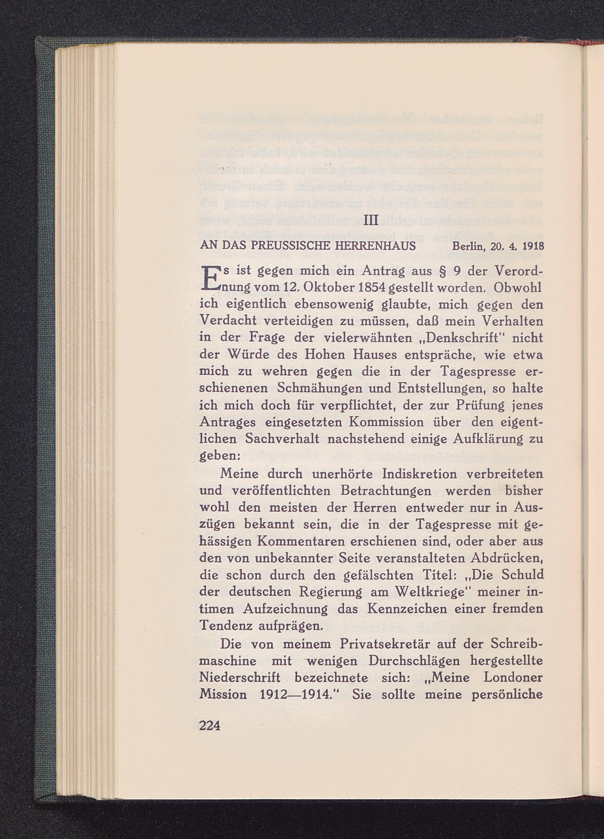 Die von meinem Privatsekretär auf der Schreib-maschine mit wenigen Durchschlägen hergestellteNiederschrift bezeichnete sich: „Meine LondonerMission 1912—1914." Sie sollte meine persönliche