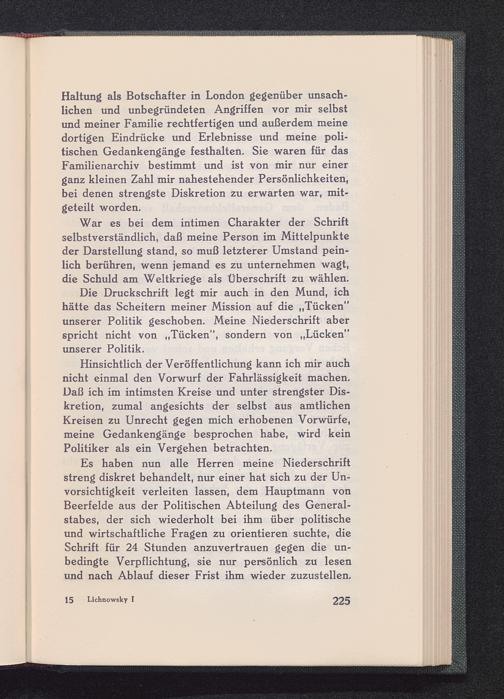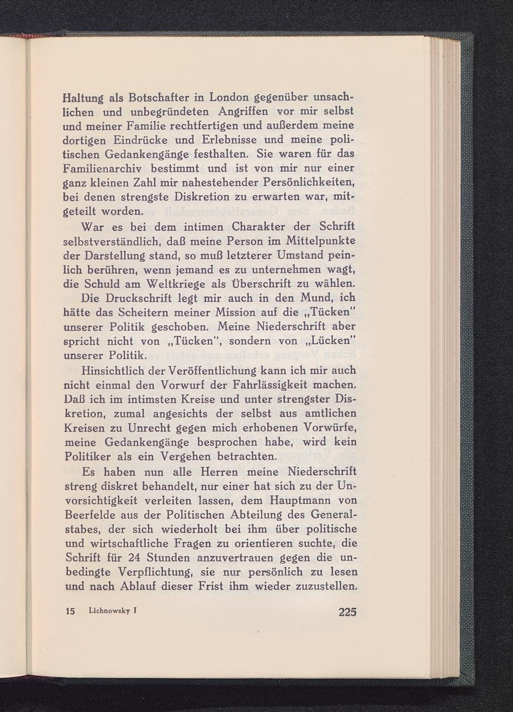 Haltung als Botschafter in London gegenüber unsach-lichen und unbegründeten Angriffen vor mir selbst»nd meiner Familie rechtfertigen und außerdem meinedortigen Eindrücke und Erlebnisse und meine poli-tischen Gedankengänge festhalten. Sie waren für dasFamilienarchiv bestimmt und ist von mir nur einerganz kleinen Zahl mir nahestehender Persönlichkeiten,bei denen strengste Diskretion zu erwarten war, mit-geteilt worden.