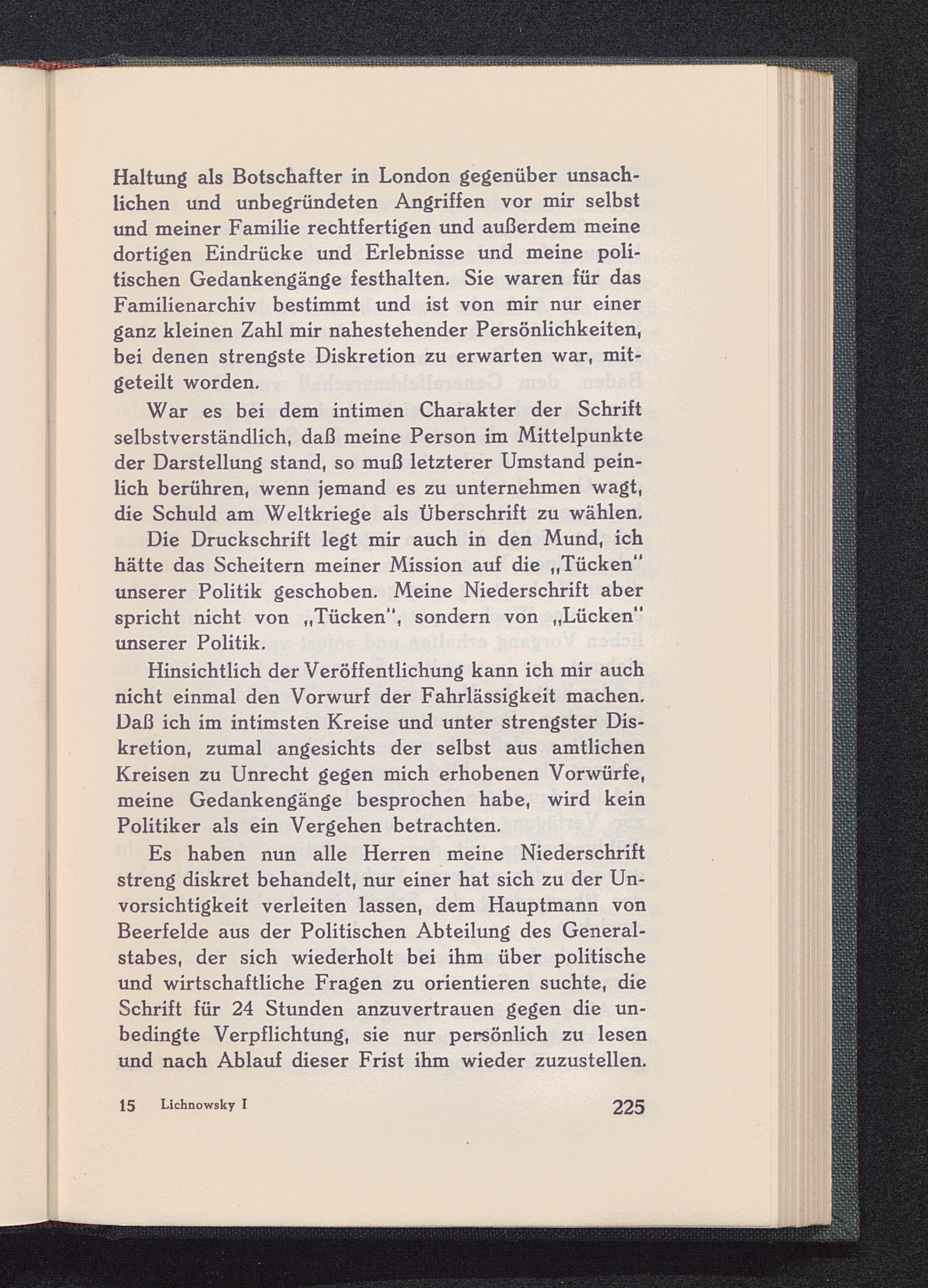 Es haben nun alle Herren meine Niederschriftstreng diskret behandelt, nur einer hat sich zu der Un-vorsichtigkeit verleiten lassen, dem Hauptmann vonBeerfelde aus der Politischen Abteilung des General-stabes, der sich wiederholt bei ihm über politischeund wirtschaftliche Fragen zu orientieren suchte, dieSchrift für 24 Stunden anzuvertrauen gegen die un-bedingte Verpflichtung, sie nur persönlich zu lesenund nach Ablauf dieser Frist ihm wieder zuzustellen.