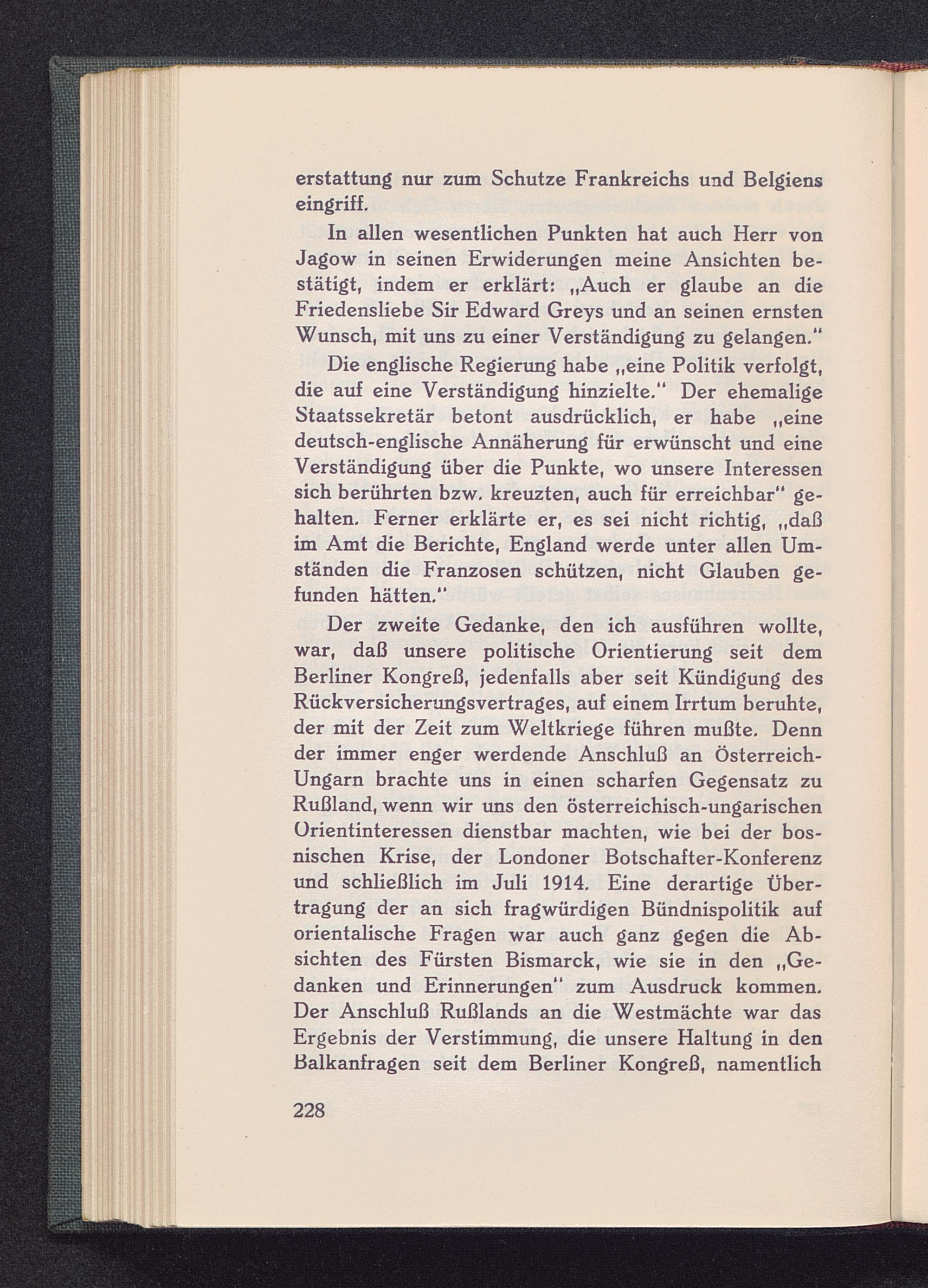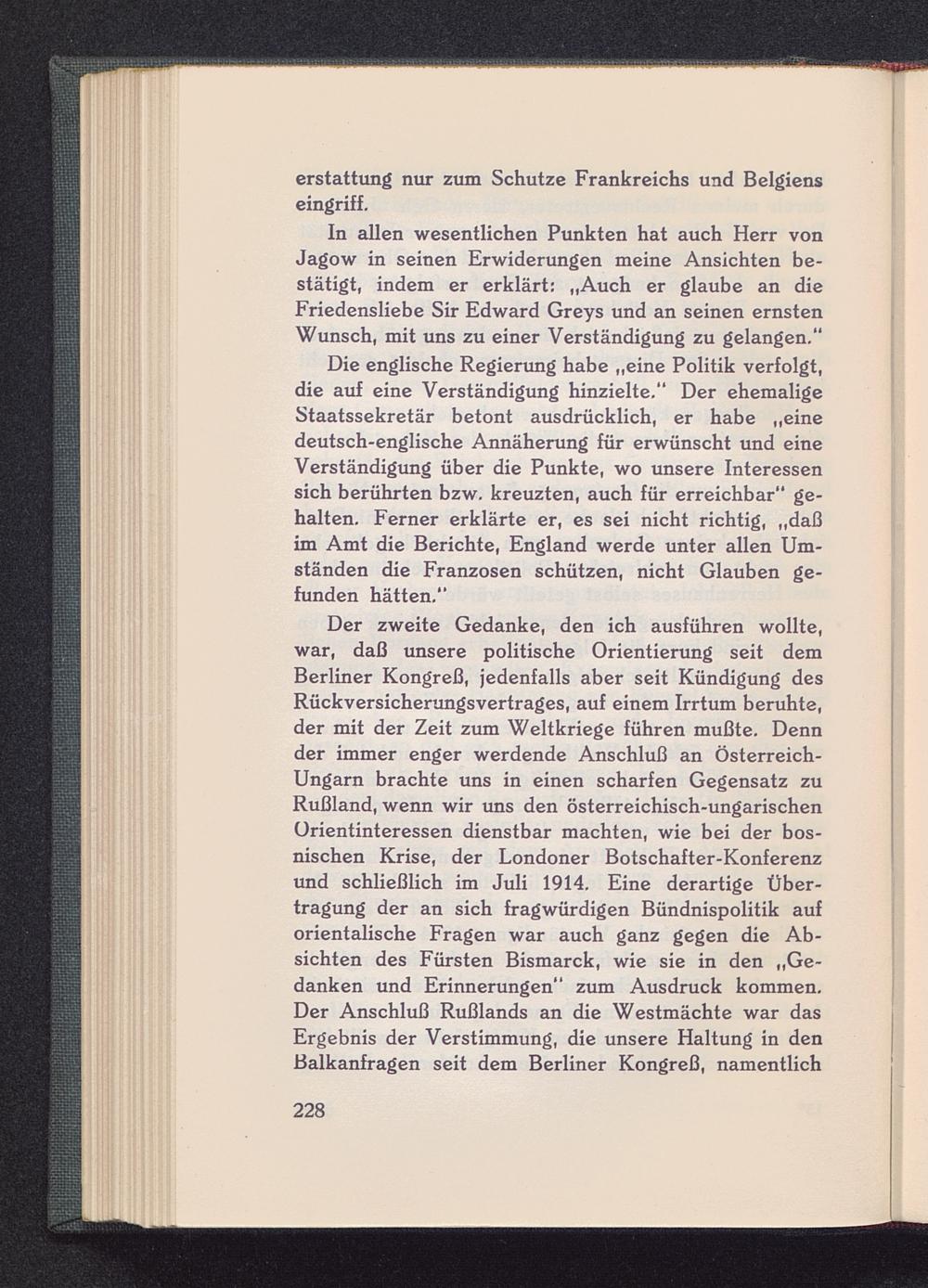 In allen wesentlichen Punkten hat auch Herr vonJagow in seinen Erwiderungen meine Ansichten be-stätigt, indem er erklärt: „Auch er glaube an dieFriedensliebe Sir Edward Greys und an seinen ernstenWunsch, mit uns zu einer Verständigung zu gelangen.“