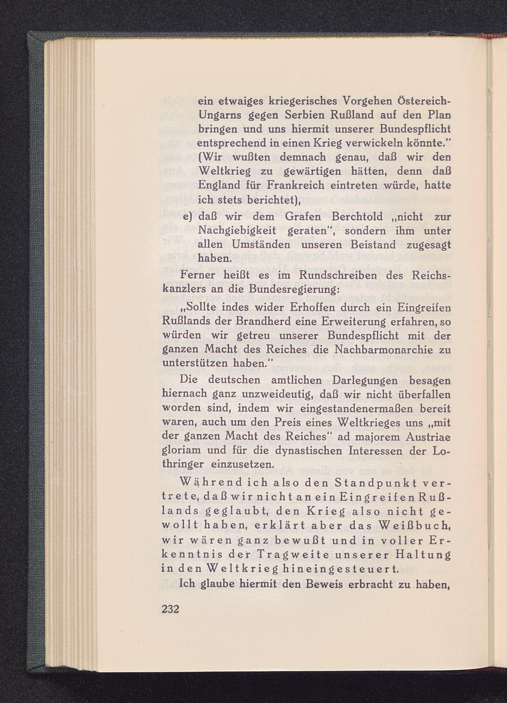ein etwaiges kriegerisches Vorgehen östereich-Ungarns gegen Serbien Rußland auf den Planbringen und uns hiermit unserer Bundespflichtentsprechend in einen Krieg verwickeln könnte.”(Wir wußten demnach genau, daß wir denWeltkrieg zu gewärtigen hätten, denn daßEngland für Frankreich eintreten würde, hatteich stets berichtet),
