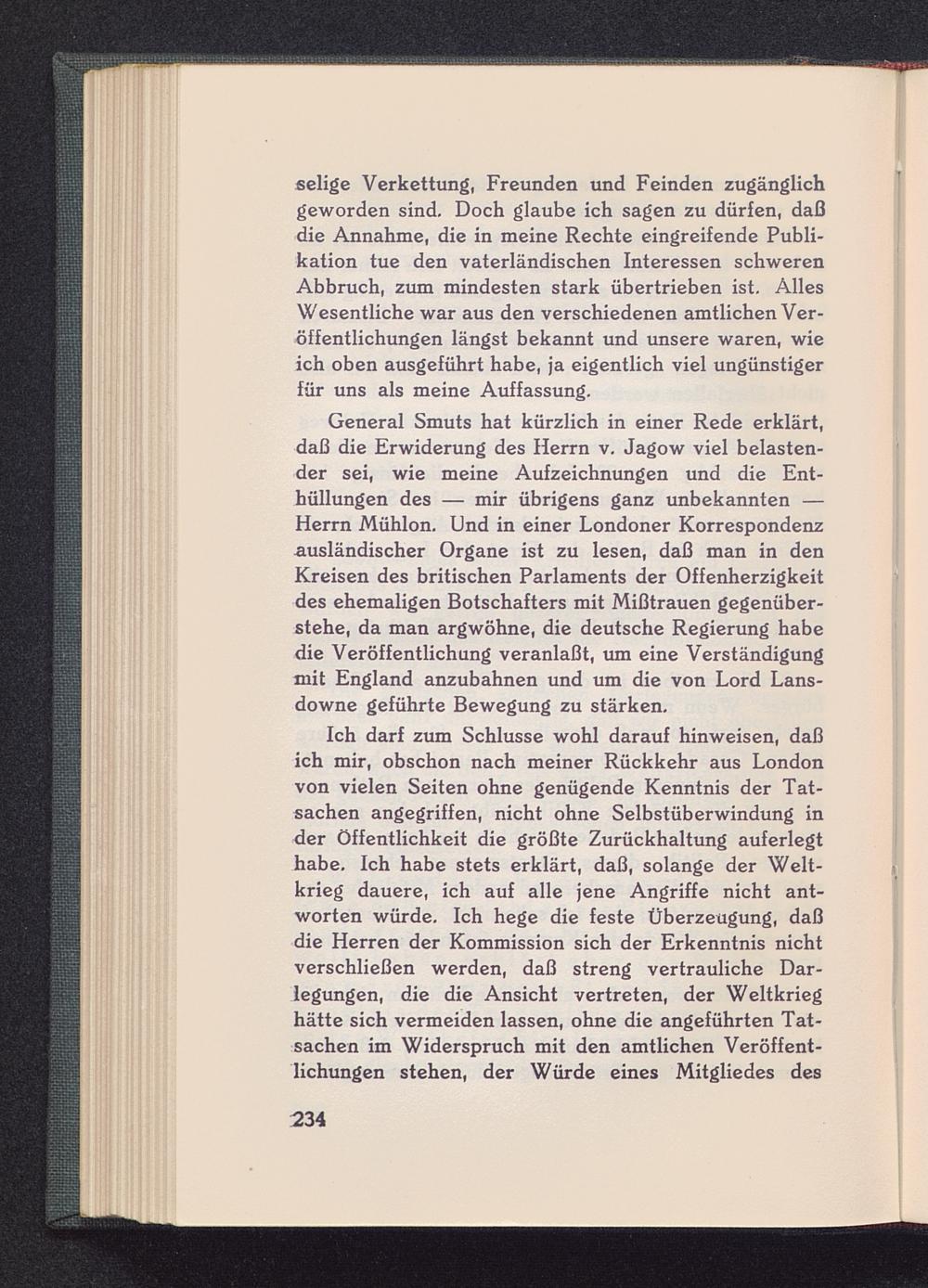 General Smuts hat kürzlich in einer Rede erklärt,daß die Erwiderung des Herrn v. Jagow viel belasten-der sei, wie meine Aufzeichnungen und die Ent-hüllungen des — mir übrigens ganz unbekannten —Herrn Mühlon. Und in einer Londoner Korrespondenzausländischer Organe ist zu lesen, daß man in denKreisen des britischen Parlaments der Offenherzigkeitdes ehemaligen Botschafters mit Mißtrauen gegenüber-stehe, da man argwöhne, die deutsche Regierung habedie Veröffentlichung veranlaßt, um eine Verständigungmit England anzubahnen und um die von Lord Lans-downe geführte Bewegung zu stärken.