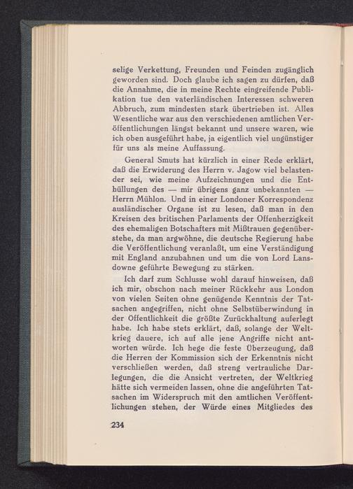 Ich darf zum Schlüsse wohl darauf hinweisen, daßich mir, obschon nach meiner Rückkehr aus London von vielen Seiten ohne genügende Kenntnis der Tat-sachen angegriffen, nicht ohne Selbstüberwindung inder Öffentlichkeit die größte Zurückhaltung auferlegthabe. Ich habe stets erklärt, daß, solange der Welt-krieg dauere, ich auf alle jene Angriffe nicht ant-worten würde. Ich hege die feste Überzeugung, daßdie Herren der Kommission sich der Erkenntnis nichtverschließen werden, daß streng vertrauliche Dar-legungen, die die Ansicht vertreten, der Weltkrieghätte sich vermeiden lassen, ohne die angeführten Tat-sachen im Widerspruch mit den amtlichen Veröffent-lichungen stehen, der Würde eines Mitgliedes des
