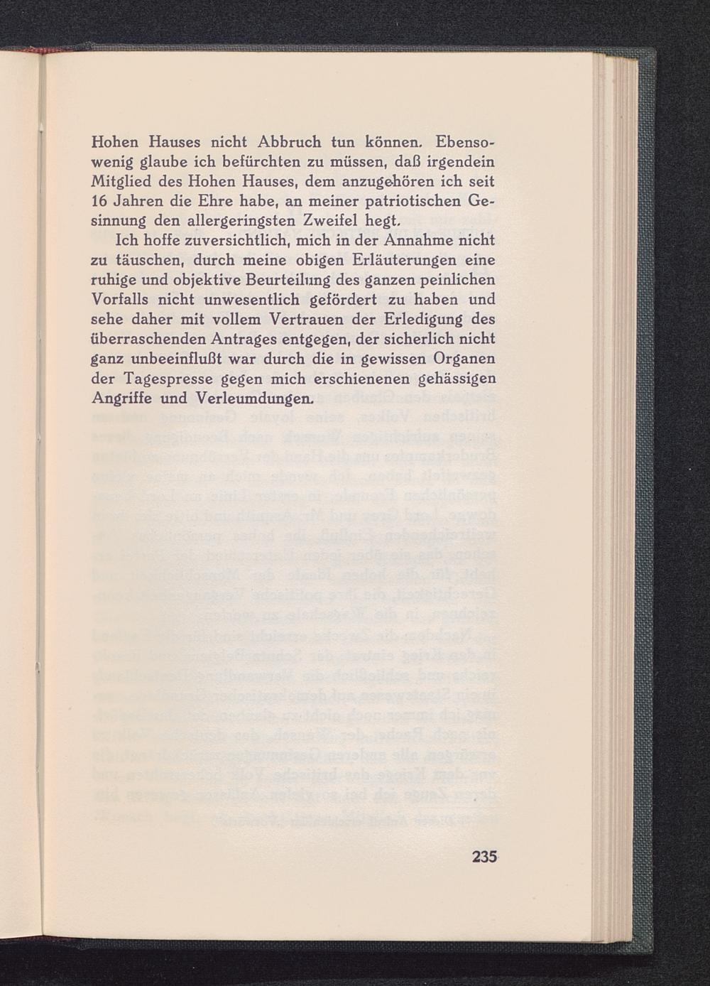 Ich hoffe zuversichtlich, mich in der Annahme nichtzu täuschen, durch meine obigen Erläuterungen eineruhige und objektive Beurteilung des ganzen peinlichenVorfalls nicht unwesentlich gefördert zu haben undsehe daher mit vollem Vertrauen der Erledigung desüberraschenden Antrages entgegen, der sicherlich nichtganz unbeeinflußt war durch die in gewissen Organender Tagespresse gegen mich erschienenen gehässigenAngriffe und Verleumdungen.