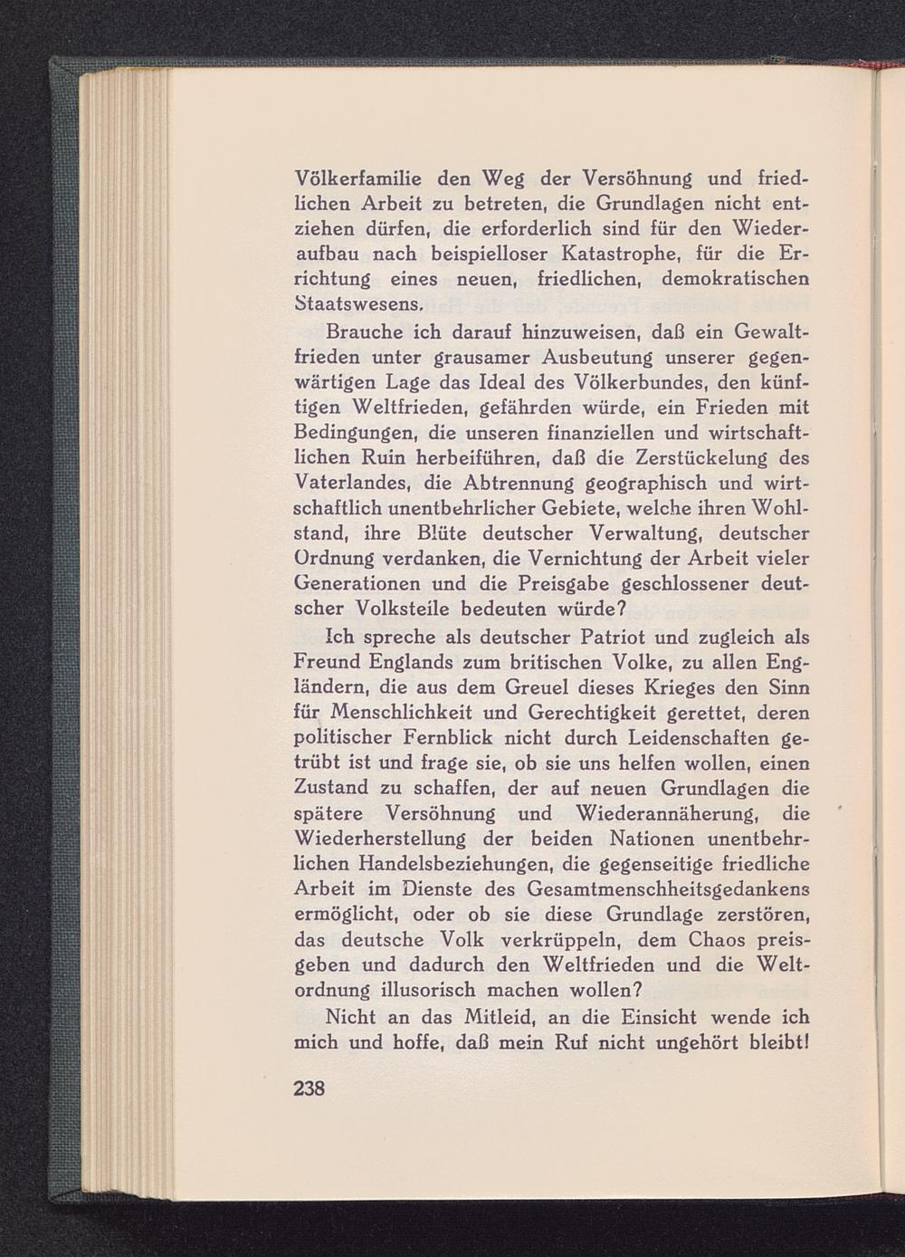 Ich spreche als deutscher Patriot und zugleich alsFreund Englands zum britischen Volke, zu allen Eng-ländern, die aus dem Greuel dieses Krieges den Sinnfür Menschlichkeit und Gerechtigkeit gerettet, derenpolitischer Fernblick nicht durch Leidenschaften ge-trübt ist und frage sie, ob sie uns helfen wollen, einenZustand zu schaffen, der auf neuen Grundlagen diespätere Versöhnung und Wiederannäherung, dieWiederherstellung der beiden Nationen unentbehr-lichen Handelsbeziehungen, die gegenseitige friedlicheArbeit im Dienste des Gesamtmenschheitsgedankensermöglicht, oder ob sie diese Grundlage zerstören,das deutsche Volk verkrüppeln, dem Chaos preis-geben und dadurch den Weltfrieden und die Welt-ordnung illusorisch machen wollen?