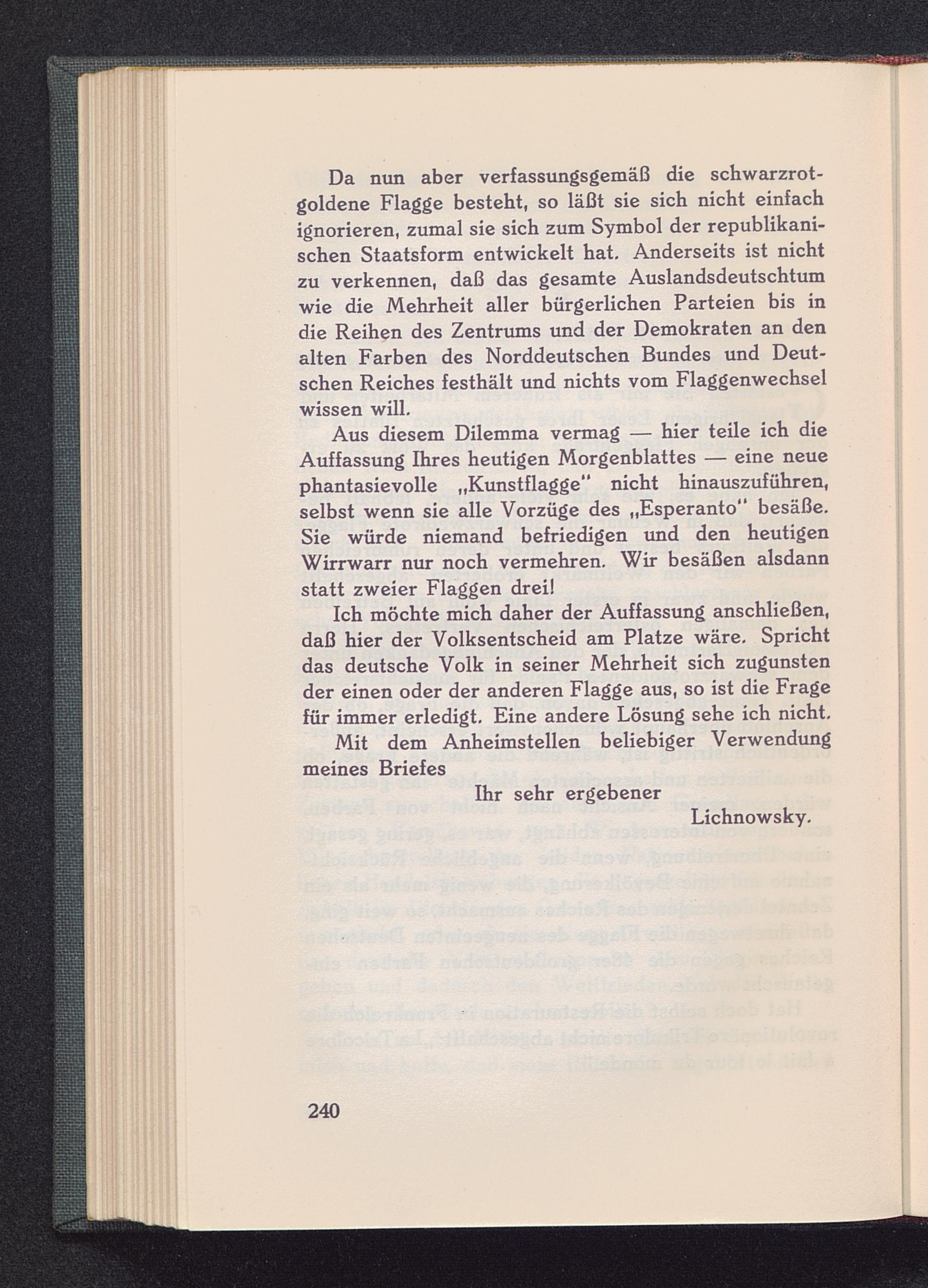Ich möchte mich daher der Auffassung anschließen,daß hier der Volksentscheid am Platze wäre. Sprichtdas deutsche Volk in seiner Mehrheit sich zugunstender einen oder der anderen Flagge aus, so ist die Fragefür immer erledigt. Eine andere Lösung sehe ich nicht.