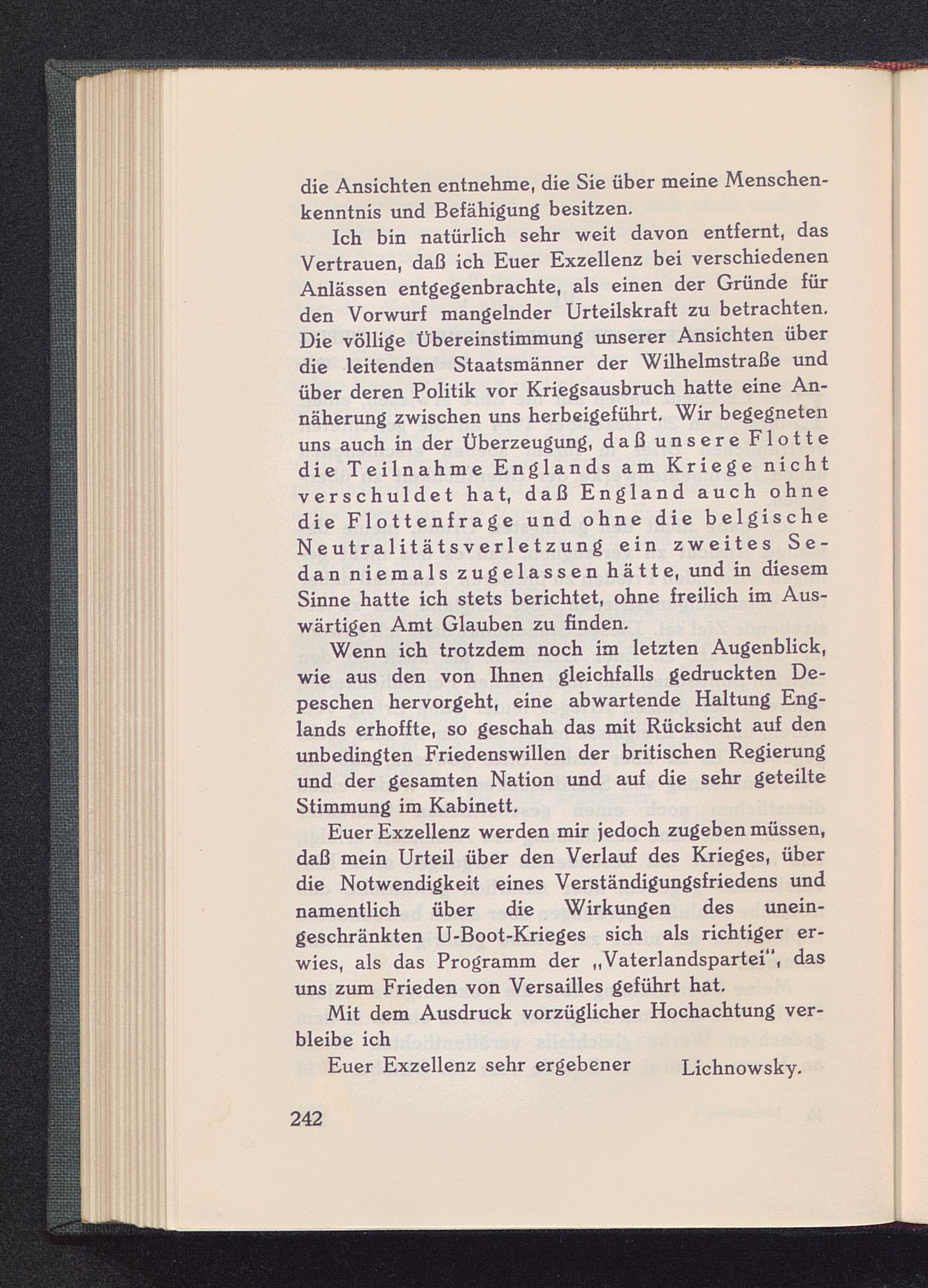 Euer Exzellenz werden mir jedoch zugeben müssen,daß mein Urteil über den Verlauf des Krieges, überdie Notwendigkeit eines Verständigungsfriedens undnamentlich über die Wirkungen des unein-geschränkten U-Boot-Krieges sich als richtiger er-wies, als das Programm der „Vaterlandspartei" , dasuns zum Frieden von Versailles geführt hat.