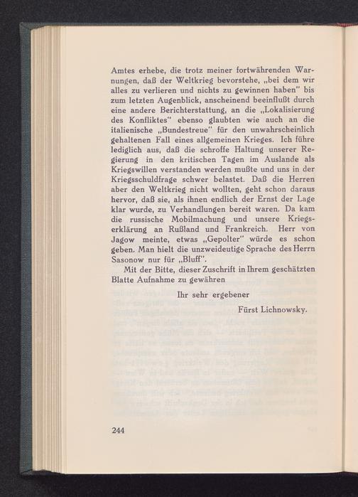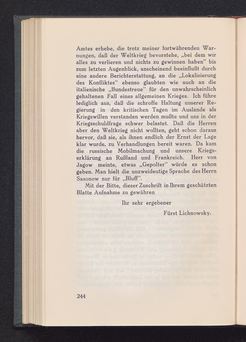 Amtes erhebe, die trotz meiner fortwährenden War-nungen, daß der Weltkrieg bevorstehe, „bei dem wiralles zu verlieren und nichts zu gewinnen haben" biszum letzten Augenblick, anscheinend beeinflußt durcheine andere Berichterstattung, an die „Lokalisierungdes Konfliktes" ebenso glaubten wie auch an dieitalienische „Bundestreue" für den unwahrscheinlichgehaltenen Fall eines allgemeinen Krieges. Ich führelediglich aus, daß die schroffe Haltung unserer Re-gierung in den kritischen Tagen im Auslande alsKriegswillen verstanden werden mußte und uns in derKriegsschuldfrage schwer belastet. Daß die Herrenaber den Weltkrieg nicht wollten, geht schon daraushervor, daß sie, als ihnen endlich der Ernst der Lageklar wurde, zu Verhandlungen bereit waren. Da kamdie russische Mobilmachung und unsere Kriegs-erklärung an Rußland und Frankreich . Herr vonJagow meinte, etwas „Gepolter" würde es schongeben. Man hielt die unzweideutige Sprache des HerrnSasonow nur für „Bluff“.