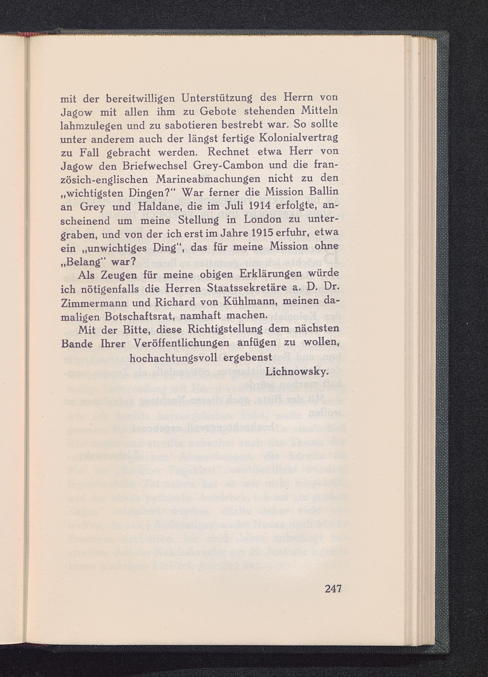 Als Zeugen für meine obigen Erklärungen würdeich nötigenfalls die Herren Staatssekretäre a. D. Dr.Zimmermann und Richard von Kühlmann , meinen da-maligen Botschaftsrat, namhaft machen.