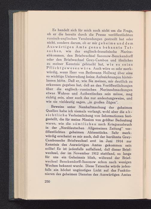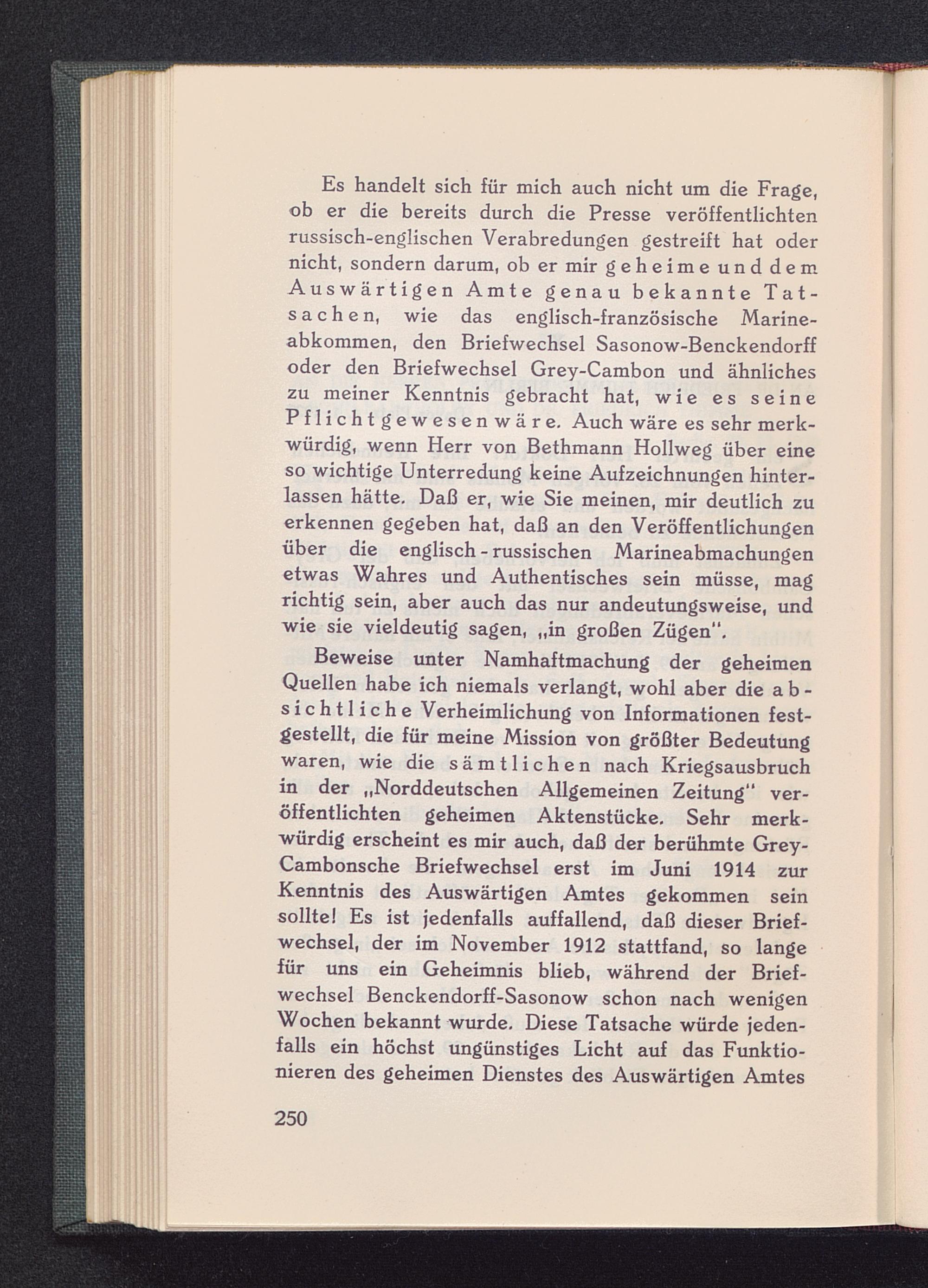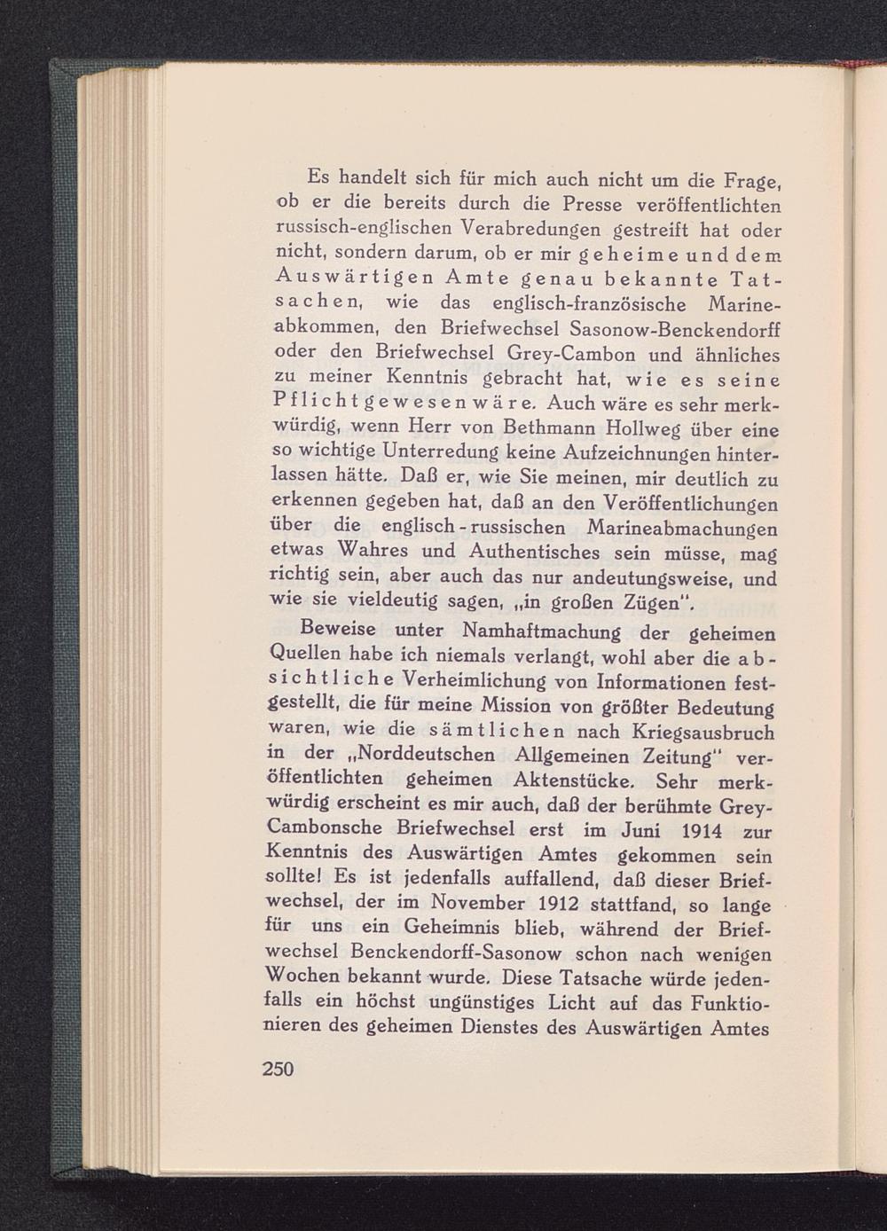 Es handelt sich für mich auch nicht um die Frage,ob er die bereits durch die Presse veröffentlichtenrussisch -englischen Verabredungen gestreift hat odernicht, sondern darum, ob er mir geheime unddemAuswärtigen Amte genau bekannte Tat-sachen, wie das englisch- französische Marine-abkommen, den Briefwechsel Sasonow-Benckendorffoder den Briefwechsel Grey-Cambon und ähnlicheszu meiner Kenntnis gebracht hat, wie es seinePflichtgewesenwäre. Auch wäre es sehr merk-würdig, wenn Herr von Bethmann Hollweg über eineso wichtige Unterredung keine Aufzeichnungen hinter-lassen hätte. Daß er, wie Sie meinen, mir deutlich zuerkennen gegeben hat, daß an den Veröffentlichungenüber die englisch - russischen Marineabmachungenetwas Wahres und Authentisches sein müsse, magrichtig sein, aber auch das nur andeutungsweise, undwie sie vieldeutig sagen, „in großen Zügen".