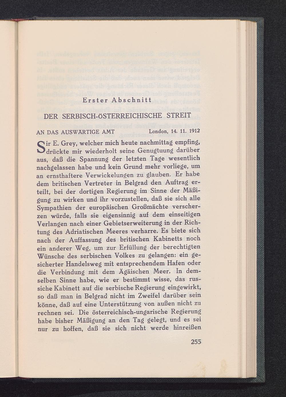 S ir E, Grey, welcher mich heute nachmittag empfing,drückte mir wiederholt seine Genugtuung darüberaus, daß die Spannung der letzten Tage wesentlichnachgelassen habe und kein Grund mehr vorliege, uman ernsthaftere Verwickelungen zu glauben. Er habedem britischen Vertreter in Belgrad den Auftrag er-teilt, bei der dortigen Regierung im Sinne der Mäßi-gung zu wirken und ihr vorzustellen, daß sie sich alleSympathien der europäischen Großmächte verscher-zen würde, falls sie eigensinnig auf dem einseitigenVerlangen nach einer Gebietserweiterung in der Rich-tung des Adriatischen Meeres verharre. Es biete sichnach der Auffassung des britischen Kabinetts nochein anderer Weg, um zur Erfüllung der berechtigtenWünsche des serbischen Volkes zu gelangen: ein ge-sicherter Handelsweg mit entsprechendem Hafen oderdie Verbindung mit dem Ägäischen Meer. In dem-selben Sinne habe, wie er bestimmt wisse, das rus-siche Kabinett auf die serbische Regierung eingewirkt,so daß man in Belgrad nicht im Zweifel darüber seinkönne, daß auf eine Unterstützung von außen nicht zurechnen sei. Die österreichisch-ungarische Regierunghabe bisher Mäßigung an den Tag gelegt, und es seinur zu hoffen, daß sie sich nicht werde hinreißen