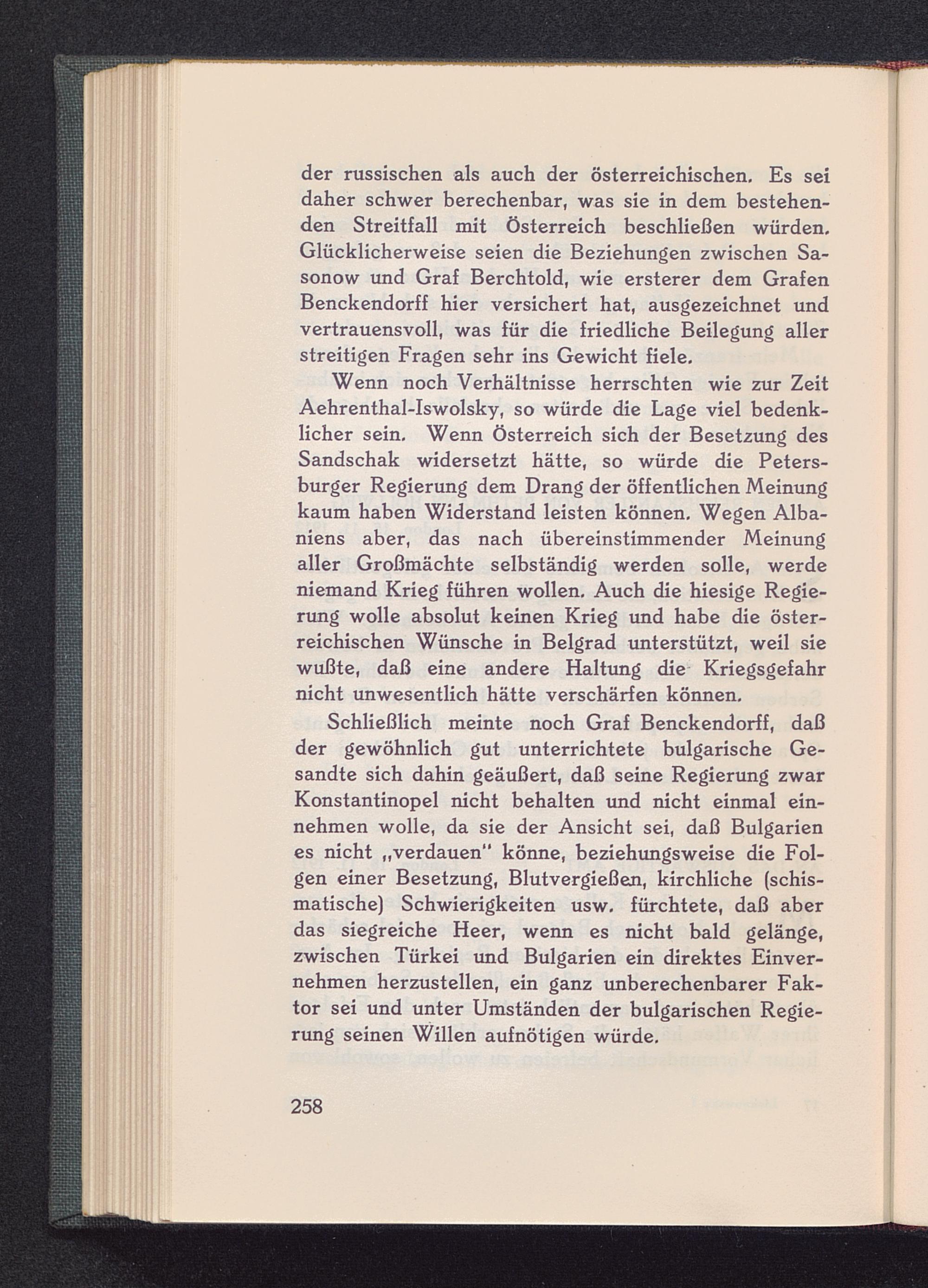 der russischen als auch der österreichischen. Es seidaher schwer berechenbar, was sie in dem bestehen-den Streitfall mit Österreich beschließen würden.Glücklicherweise seien die Beziehungen zwischen Sa -sonow und Graf Berchtold, wie ersterer dem GrafenBenckendorff hier versichert hat, ausgezeichnet undvertrauensvoll, was für die friedliche Beilegung allerstreitigen Fragen sehr ins Gewicht fiele.
