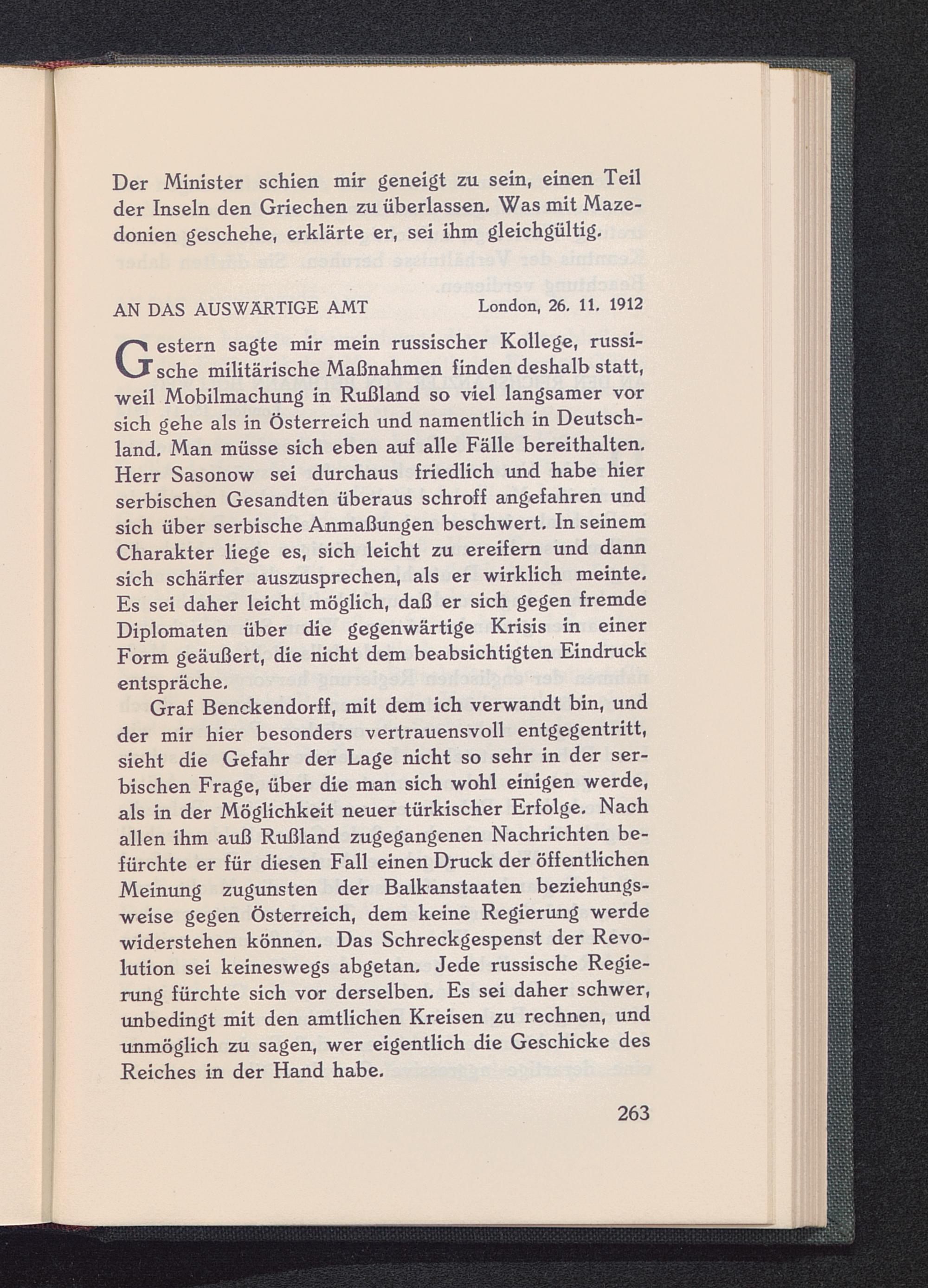 Der Minister schien mir geneigt zu sein, einen Teilder Inseln den Griechen zu überlassen. Was mit Maze-donien geschehe, erklärte er, sei ihm gleichgültig.