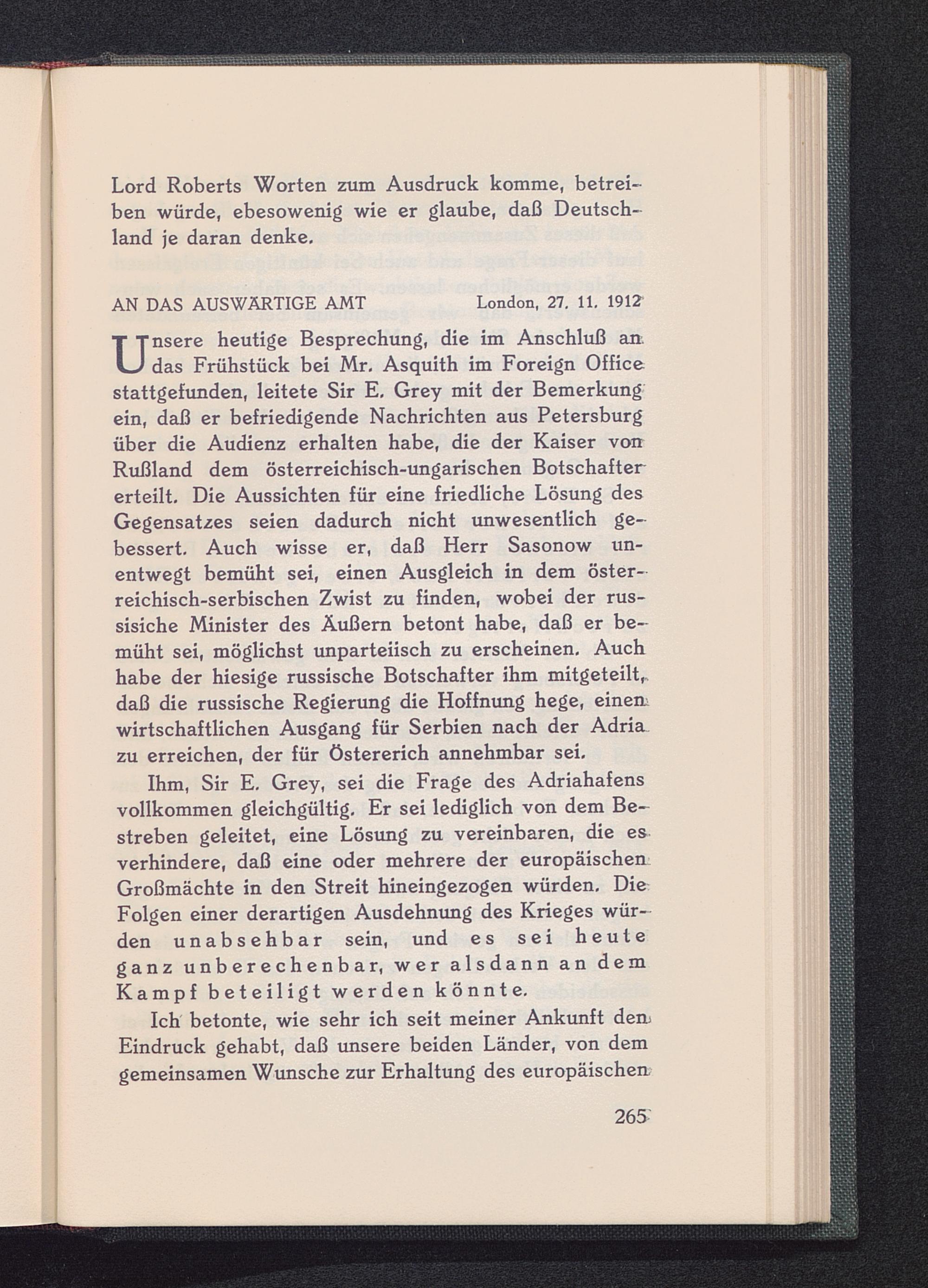 das Frühstück bei Mr. Asquith im Foreign Officestattgefunden, leitete Sir E, Grey mit der Bemerkungein, daß er befriedigende Nachrichten aus Petersburg über die Audienz erhalten habe, die der Kaiser vonRußland dem österreichisch-ungarischen Botschaftererteilt. Die Aussichten für eine friedliche Lösung desGegensatzes seien dadurch nicht imwesentlich ge-bessert. Auch wisse er, daß Herr Sasonow un-entwegt bemüht sei, einen Ausgleich in dem öster-reichisch-serbischen Zwist zu finden, wobei der rus-sisiche Minister des Äußern betont habe, daß er be-müht sei, möglichst unparteiisch zu erscheinen. Auchhabe der hiesige russische Botschafter ihm mitgeteilt,*daß die russische Regierung die Hoffnung hege, einemwirtschaftlichen Ausgang für Serbien nach der Adriazu erreichen, der für östererich annehmbar sei.