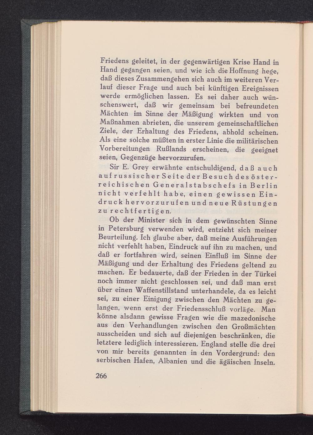 Ob der Minister sich in dem gewünschten Sinnein Petersburg verwenden wird, entzieht sich meinerBeurteilung. Ich glaube aber, daß meine Ausführungennicht verfehlt haben, Eindruck auf ihn zu machen, unddaß er fortfahren wird, seinen Einfluß im Sinne derMäßigung und der Erhaltung des Friedens geltend zumachen. Er bedauerte, daß der Frieden in der Türkei noch immer nicht geschlossen sei, und daß man erstüber einen Waffenstillstand unterhandele, da es leichtsei, zu einer Einigung zwischen den Mächten zu ge-langen, wenn erst der Friedensschluß vorläge. Mankönne alsdann gewisse Fragen wie die mazedonischeaus den Verhandlungen zwischen den Großmächtenausscheiden und sich auf diejenigen beschränken, dieletztere lediglich interessieren. England stelle die dreivon mir bereits genannten in den Vordergrund: denserbischen Hafen, Albanien und die ägäischen Inseln.