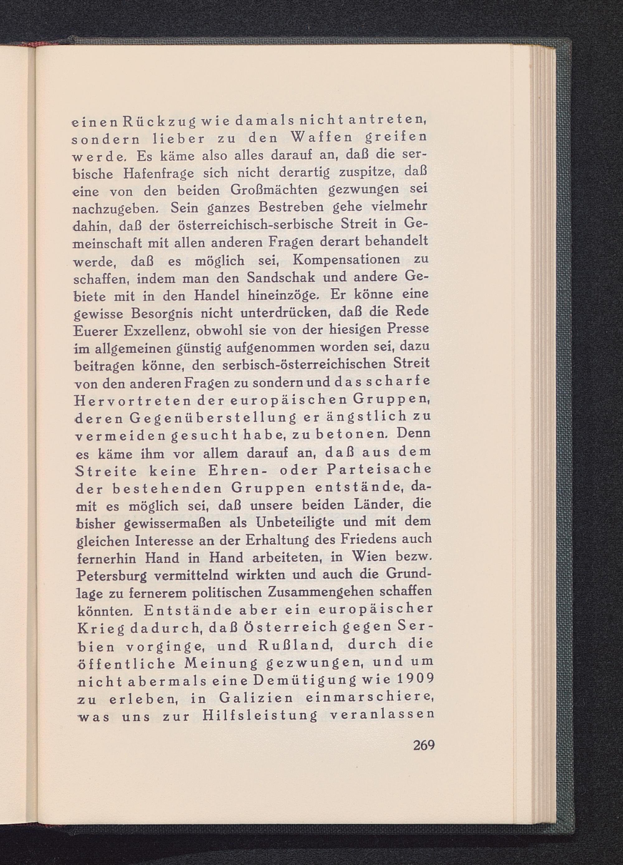 einen Rückzug wie damals nicht antreten,sondern lieber zu den Waffen greifenwerde. Es käme also alles darauf an, daß die ser-bische Hafenfrage sich nicht derartig zuspitze, daßeine von den beiden Großmächten gezwungen seinachzugeben. Sein ganzes Bestreben gehe vielmehrdahin, daß der österreichisch-serbische Streit in Ge-meinschaft mit allen anderen Fragen derart behandeltwerde, daß es möglich sei, Kompensationen zuschaffen, indem man den Sandschak und andere Ge-biete mit in den Handel hineinzöge. Er könne einegewisse Besorgnis nicht unterdrücken, daß die RedeEuerer Exzellenz, obwohl sie von der hiesigen Presseim allgemeinen günstig aufgenommen worden sei, dazubeitragen könne, den serbisch -österreichischen Streitvon den anderen Fragen zu sondern und dasscharfeHervortreten der europäischen Gruppen,deren Gegenüberstellung er ängstlich zuvermeiden gesucht habe, zu betonen. Dennes käme ihm vor allem darauf an, daß aus demStreite keine Ehren- oder Parteisacheder bestehenden Gruppen entstände, da-mit es möglich sei, daß unsere beiden Länder, diebisher gewissermaßen als Unbeteiligte und mit demgleichen Interesse an der Erhaltung des Friedens auchfernerhin Hand in Hand arbeiteten, in Wien bezw.Petersburg vermittelnd wirkten und auch die Grund-lage zu fernerem politischen Zusammengehen schaffenkönnten. Entstände aber ein europäischerKrieg dadurch, daß Österreich gegen Ser-bien vorginge, und Rußland, durch dieöffentliche Meinung gezwungen, und umnicht abermals eine Demütigung wie 1909zu erleben, in Galizien einmarschiere,was uns zur Hilfsleistung veranlassen