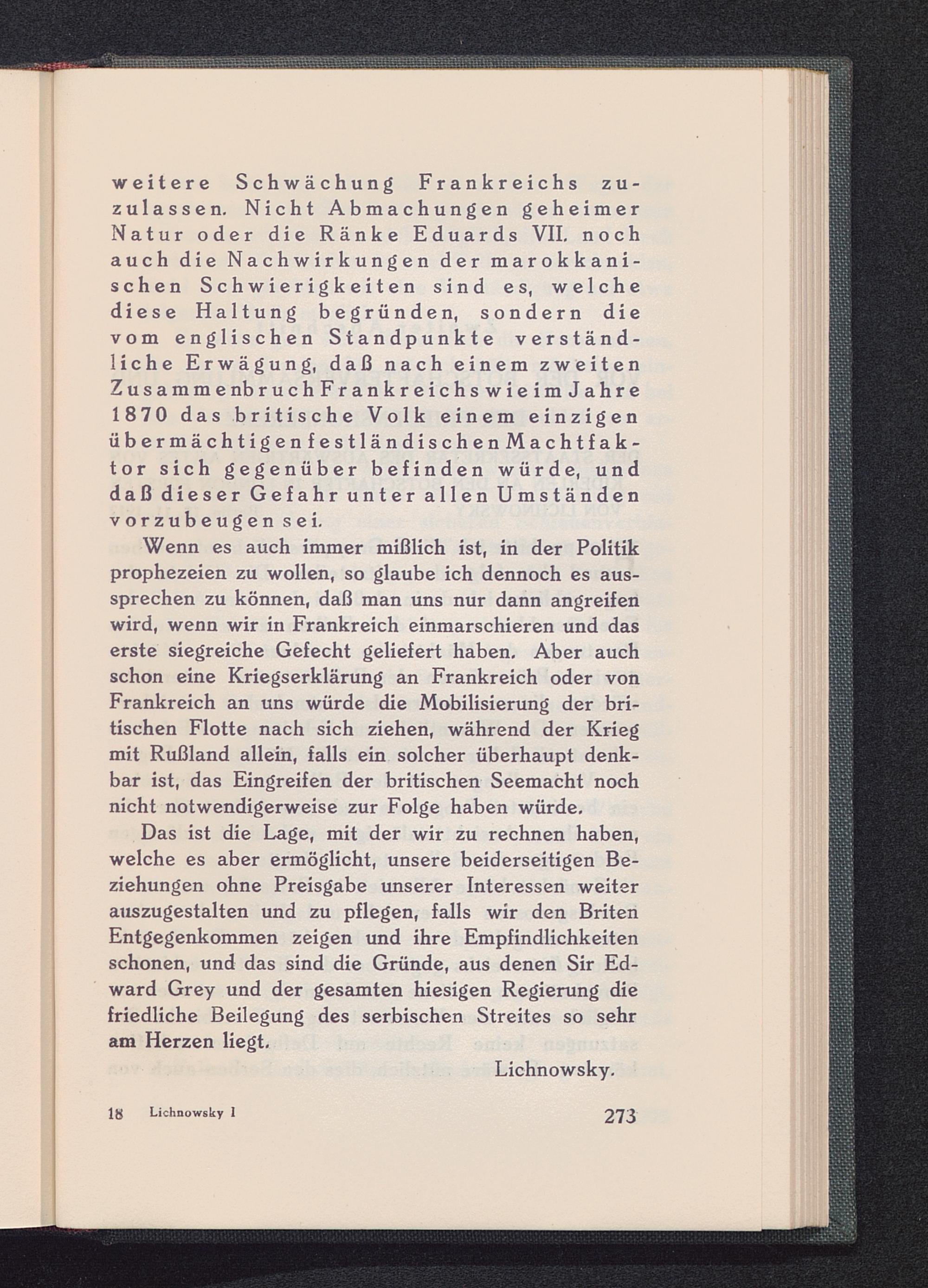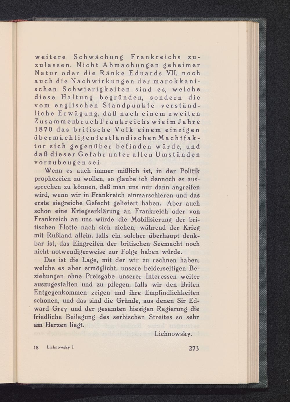 Wenn es auch immer mißlich ist, in der Politikprophezeien zu wollen, so glaube ich dennoch es aus-sprechen zu können, daß man uns nur dann angreifenwird, wenn wir in Frankreich einmarschieren und daserste siegreiche Gefecht geliefert haben. Aber auchschon eine Kriegserklärung an Frankreich oder vonFrankreich an uns würde die Mobilisierung der bri-tischen Flotte nach sich ziehen, während der Kriegmit Rußland allein, falls ein solcher überhaupt denk-bar ist, das Eingreifen der britischen Seemacht nochnicht notwendigerweise zur Folge haben würde.