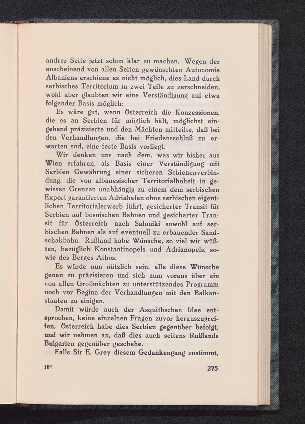 andrer Seite jetzt schon klar zu machen. Wegen deranscheinend von allen Seiten gewünschten AutonomieAlbaniens erschiene es nicht möglich, dies Land durchserbisches Territorium in zwei Teile zu zerschneiden,wohl aber glaubten wir eine Verständigung auf etwafolgender Basis möglich: