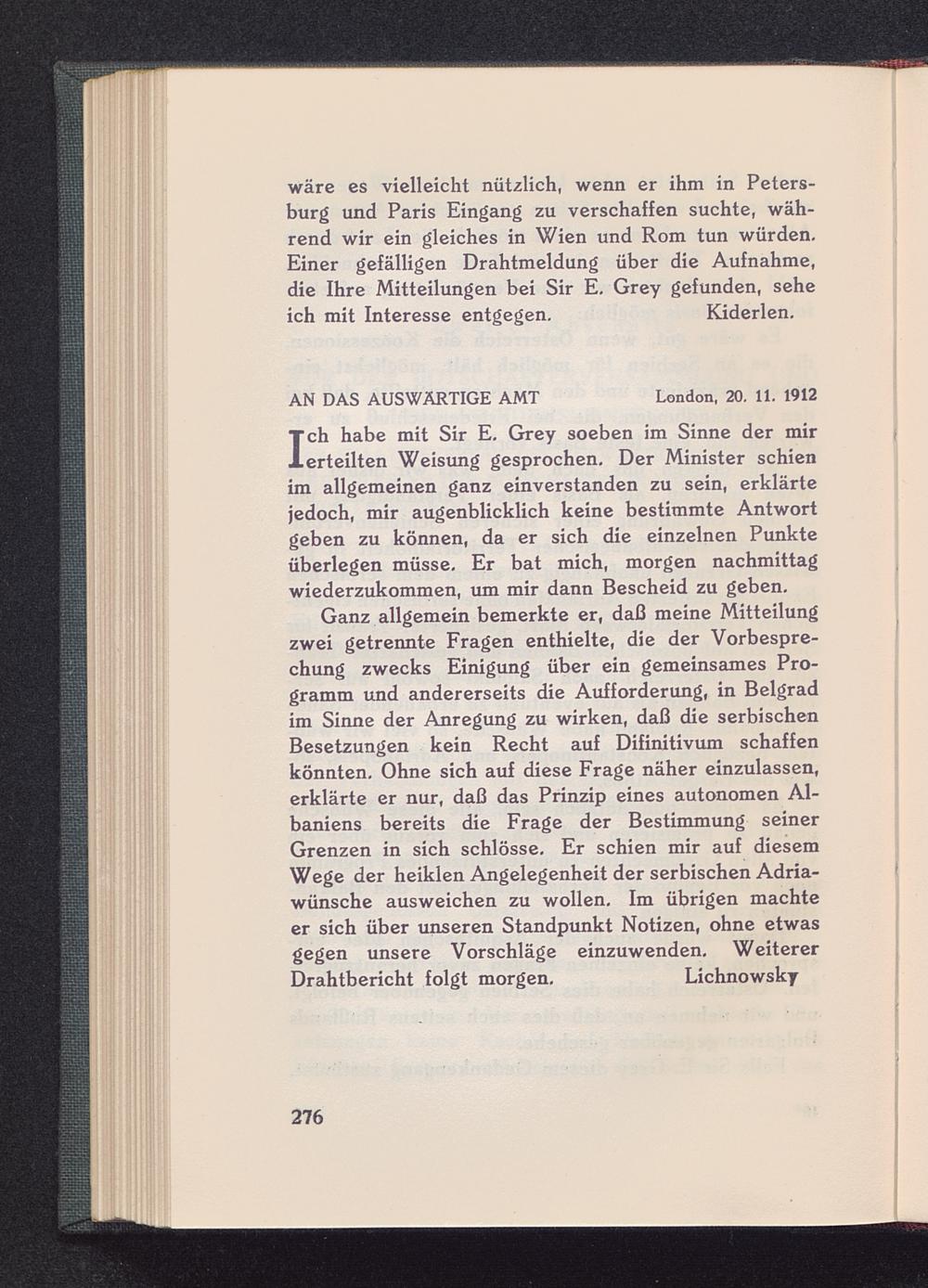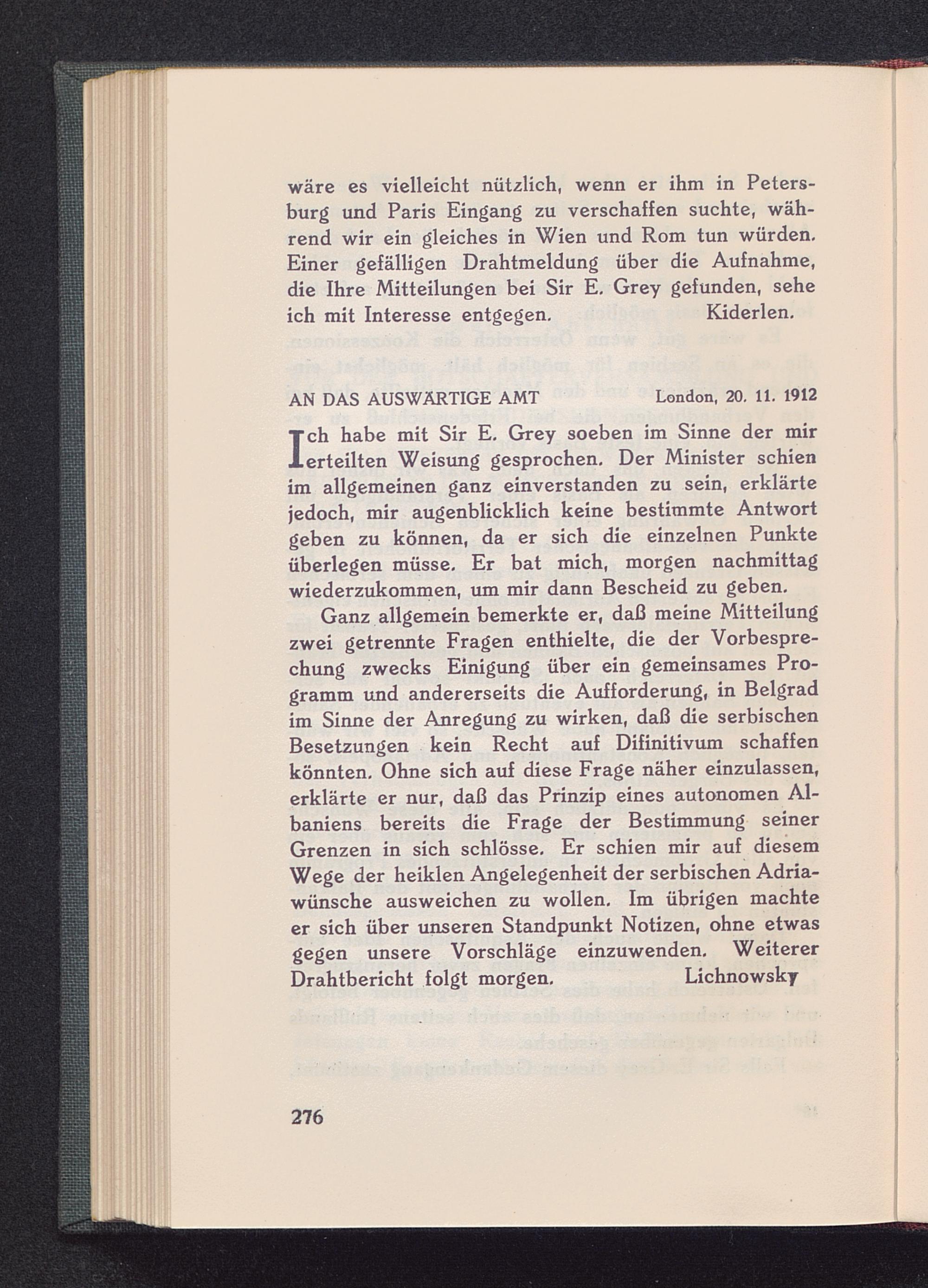 I ch habe mit Sir E. Grey soeben im Sinne der mirerteilten Weisung gesprochen. Der Minister schienim allgemeinen ganz einverstanden zu sein, erklärtejedoch, mir augenblicklich keine bestimmte Antwortgeben zu können, da er sich die einzelnen Punkteüberlegen müsse. Er bat mich, morgen nachmittagwiederzukommen, um mir dann Bescheid zu geben.